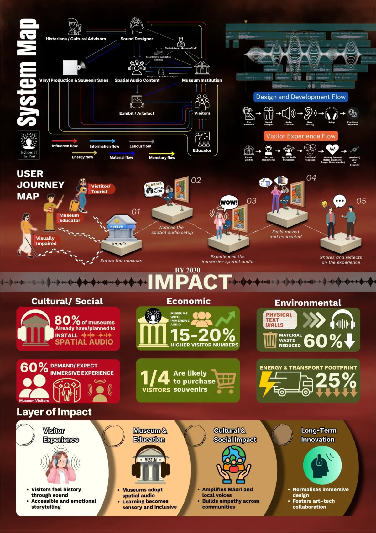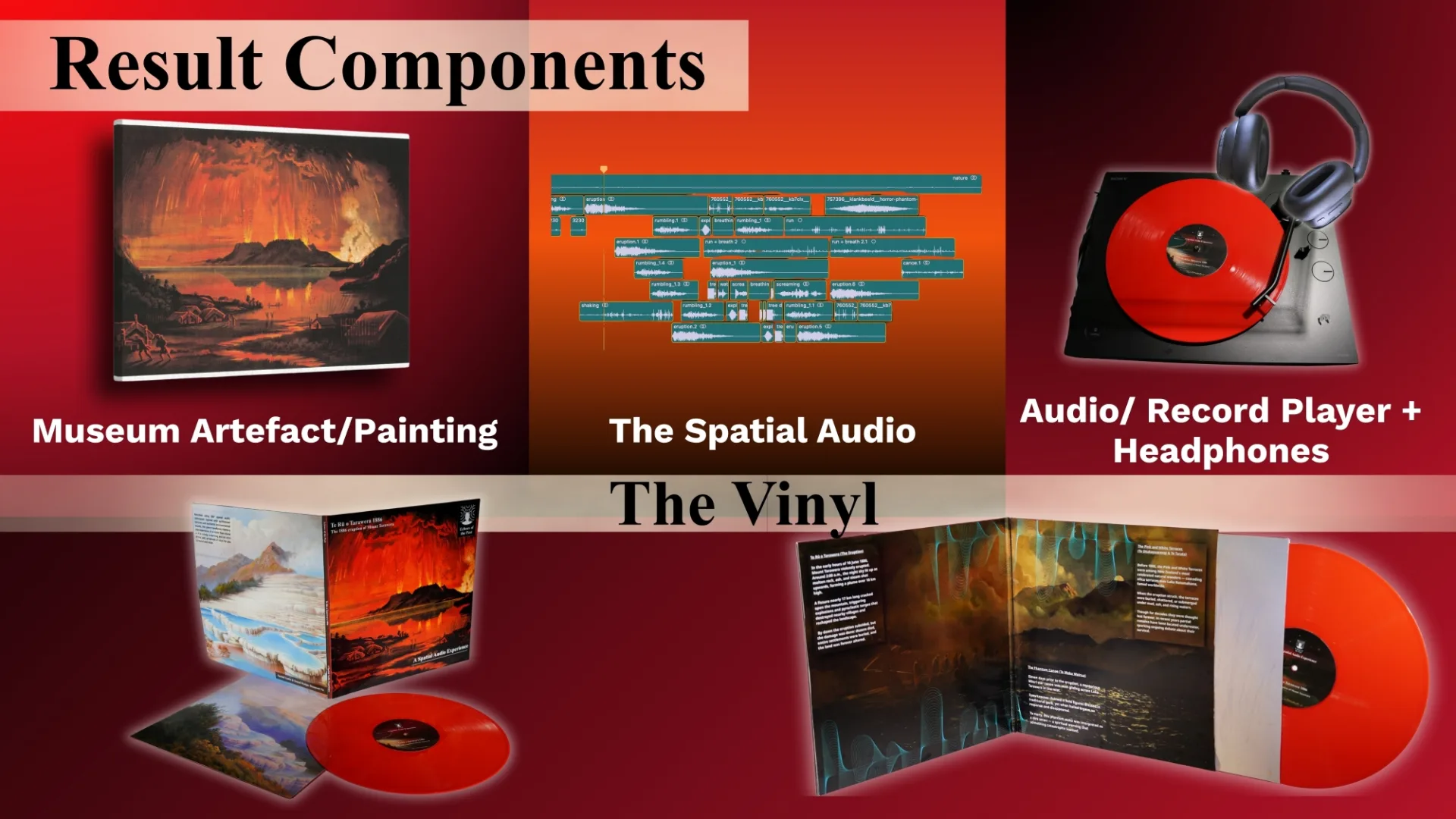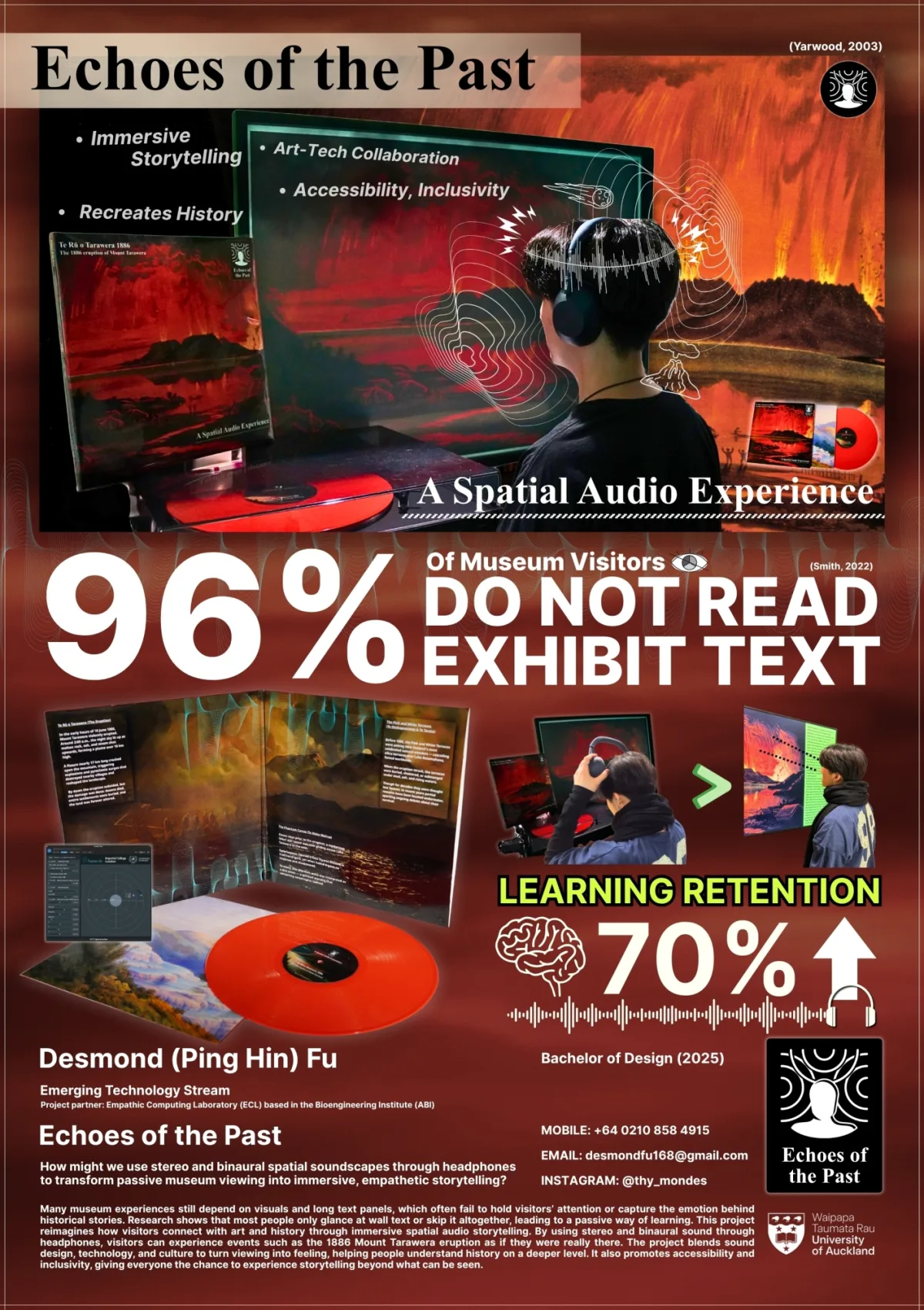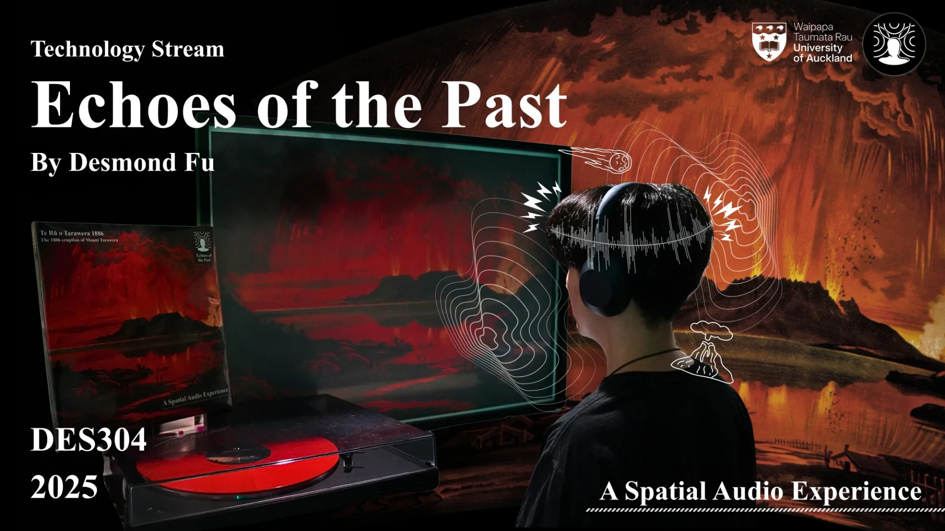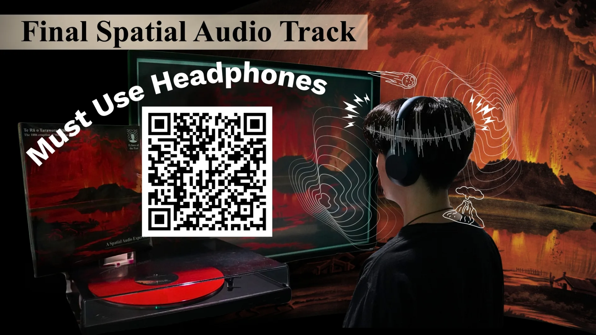 Many museum experiences still depend on visuals and long text panels, which often fail to hold visitors’ attention or capture the emotion behind historical stories. Research shows that most people only glance at wall text or skip it altogether, leading to a passive way of learning. This project reimagines how visitors connect with art and history through immersive spatial audio storytelling. By using stereo and binaural sound through headphones, visitors can experience events such as the 1886 Mount Tarawera eruption as if they were really there. The project blends sound design, technology, and culture to turn viewing into feeling, helping people understand history on a deeper level. It also promotes accessibility and inclusivity, giving everyone the chance to experience storytelling beyond what can be seen.