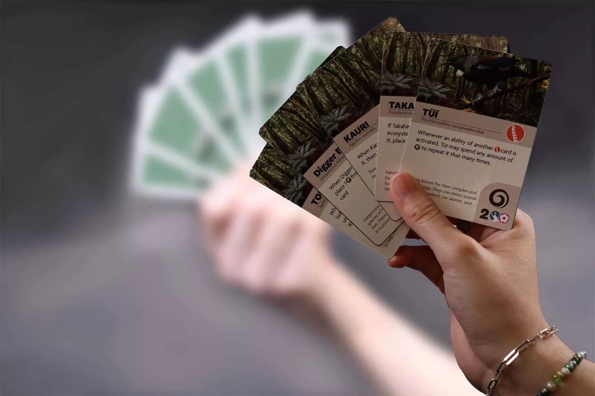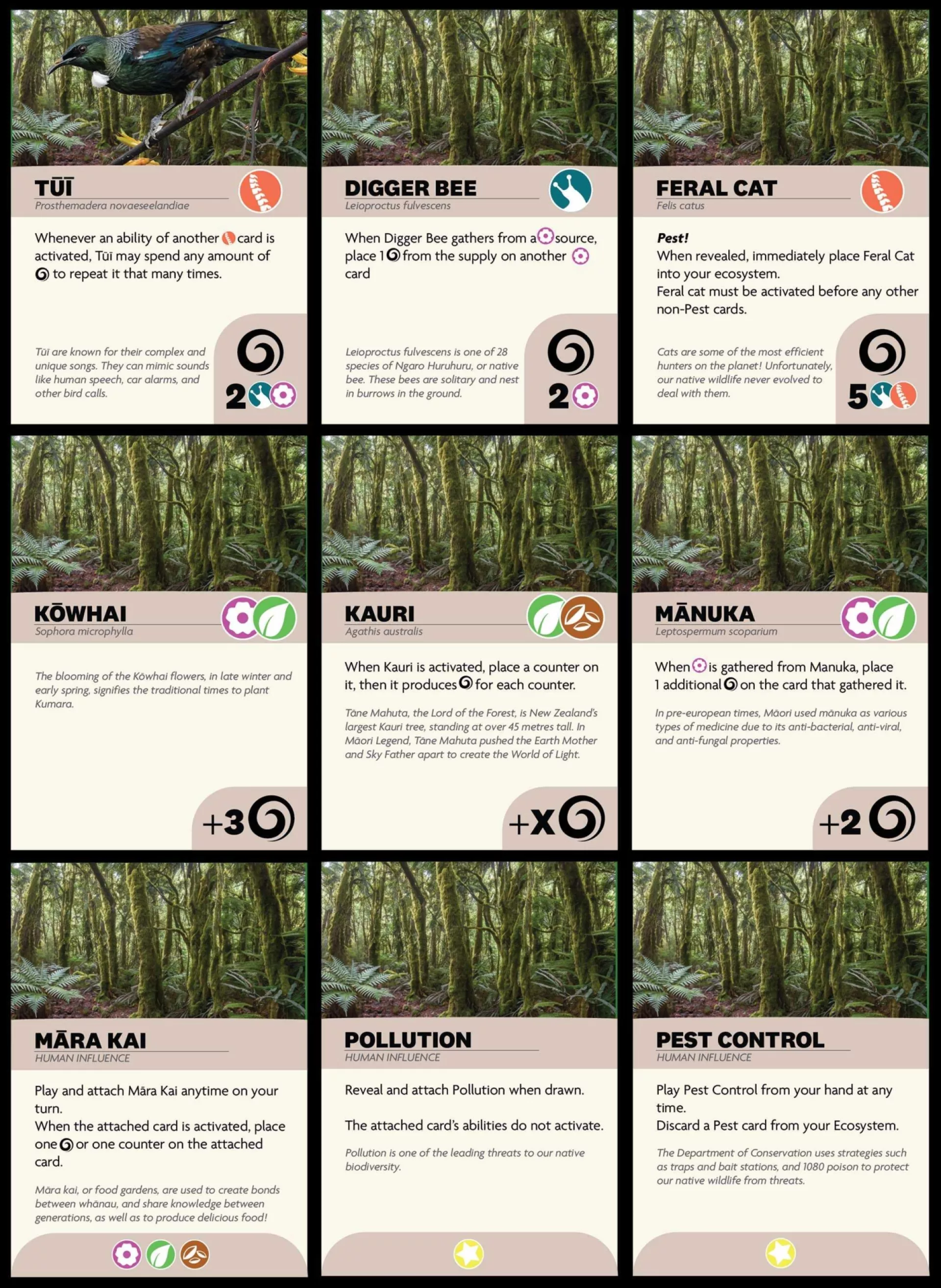 In Ecosystem: Aotearoa, players create their own ecosystem with cards that represent New Zealand's unique species. Each card plays a role in generating or transferring 'Mouri' tokens between cards or expending mouri to perform special actions based on the animal or plants' real-world behaviour.
