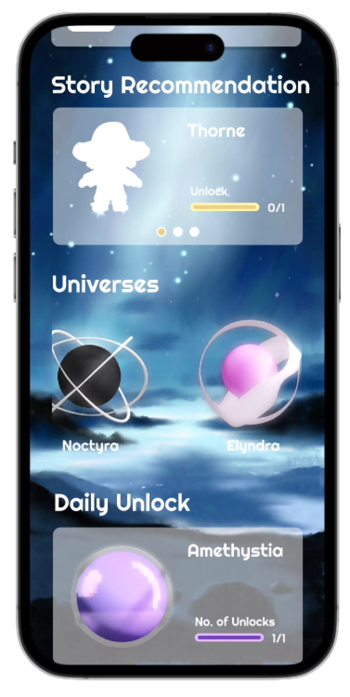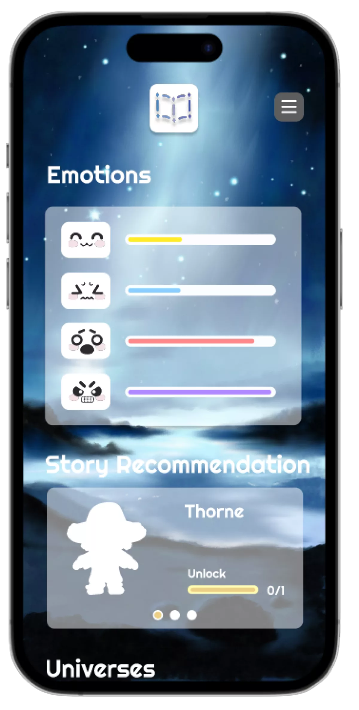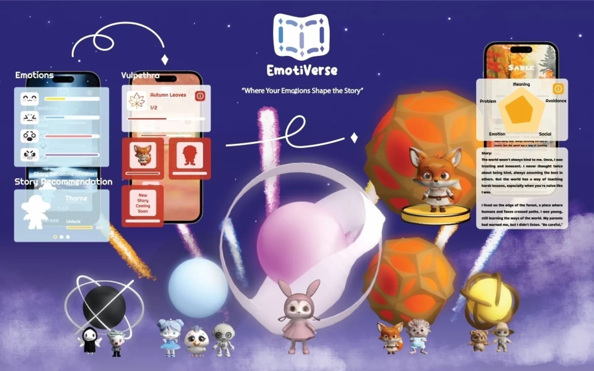 The final prototype, EmotiVerse, aims to support young people in managing psychological distress by providing real-time, emotion-based storytelling experiences tailored to their emotional state. The app is designed for teenagers and young adults facing psychological distress. It captures and interprets the changes in users' emotional data through detection from sensors via wearable integration. The data is processed and analysed through AI emotion recognition to detect various emotions. Stories will automatically be recommended to the users based on the users’ emotions and coping strategies. Characters with similar coping systems will be suggested because they will have similar management methods. Daily unlocks will be different every day and the new characters will be added to the story collections.