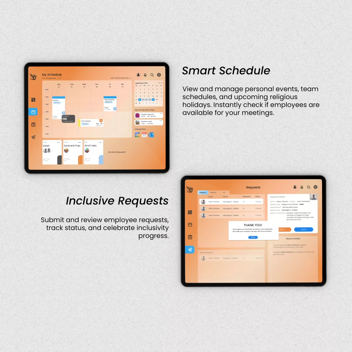 HolyDay includes an Inclusive Calendar that integrates religious holidays from diverse faiths, a Confidential Time-Off Request feature that allows employees to submit religious leave requests privately, and an Analytics Dashboard for managers to track inclusivity efforts. Each feature has been designed to seamlessly integrate into existing work systems, offering a practical solution for both small businesses and larger corporations.