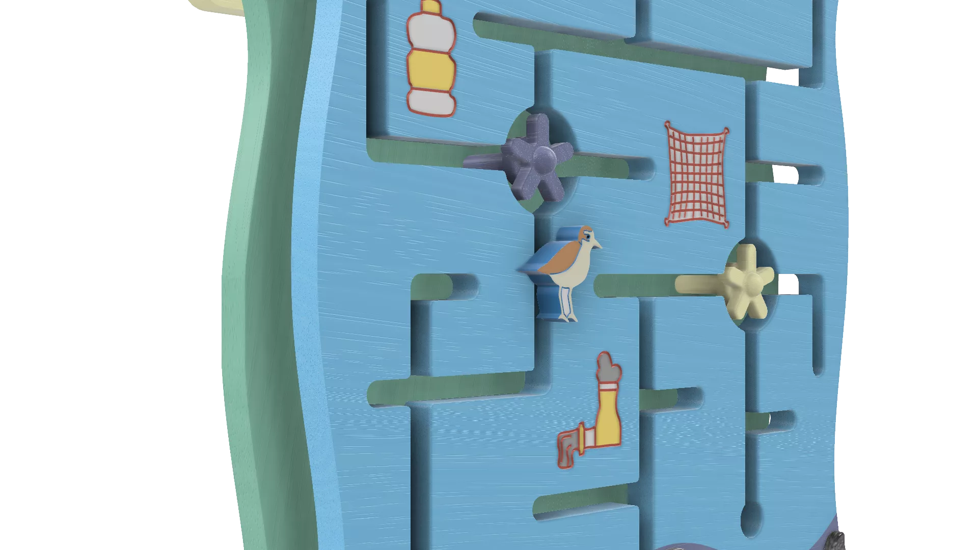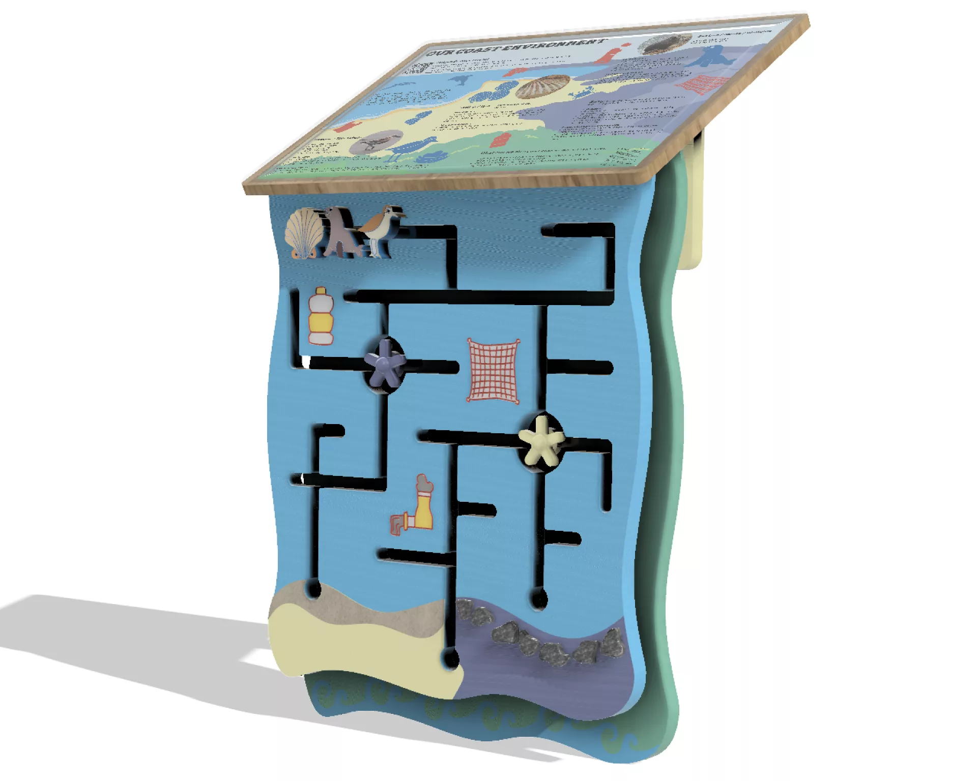 The icons and colours of species, pollution and habitats on the game panel correspond to the information board. The goal is to send the animal slider to the coastal habitat (three circles) below while avoiding pollutants and fishing nets while moving.