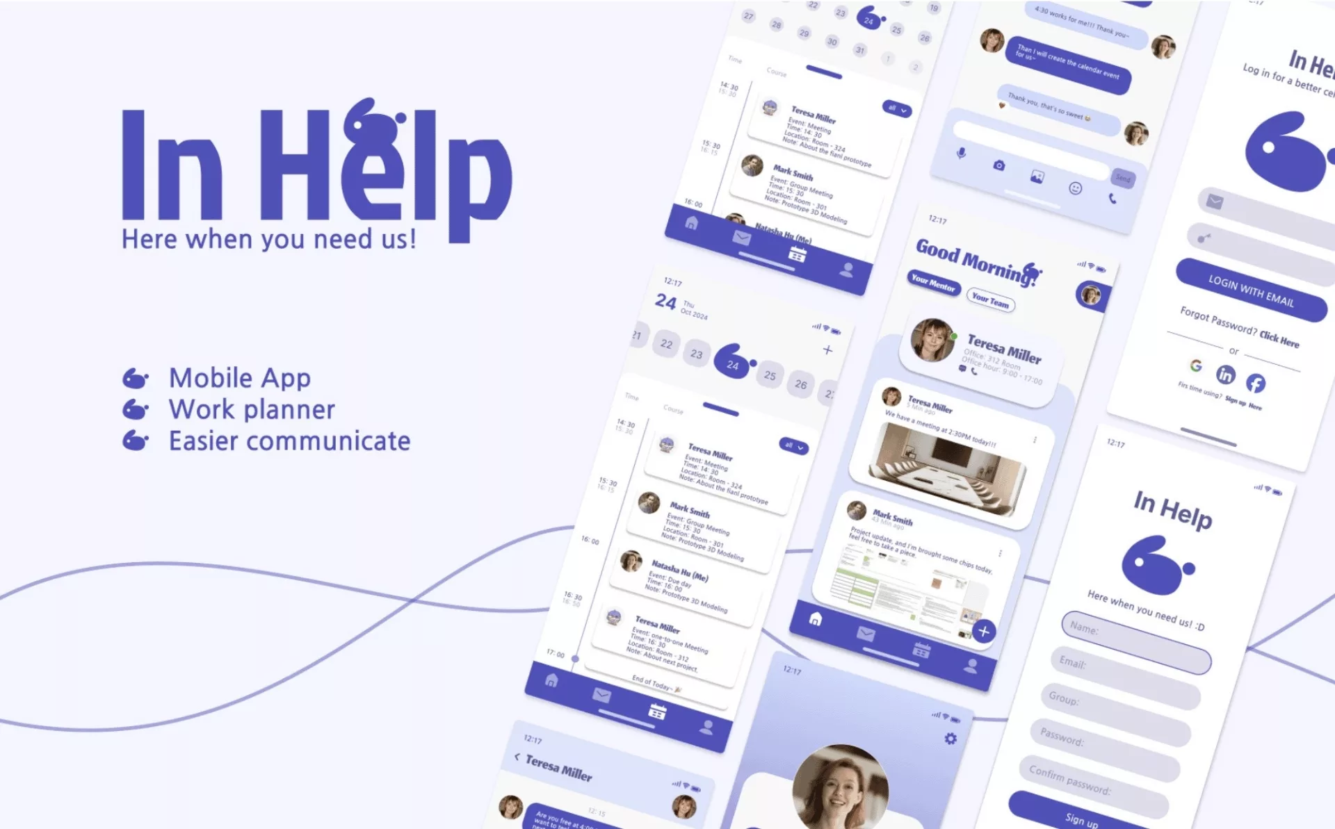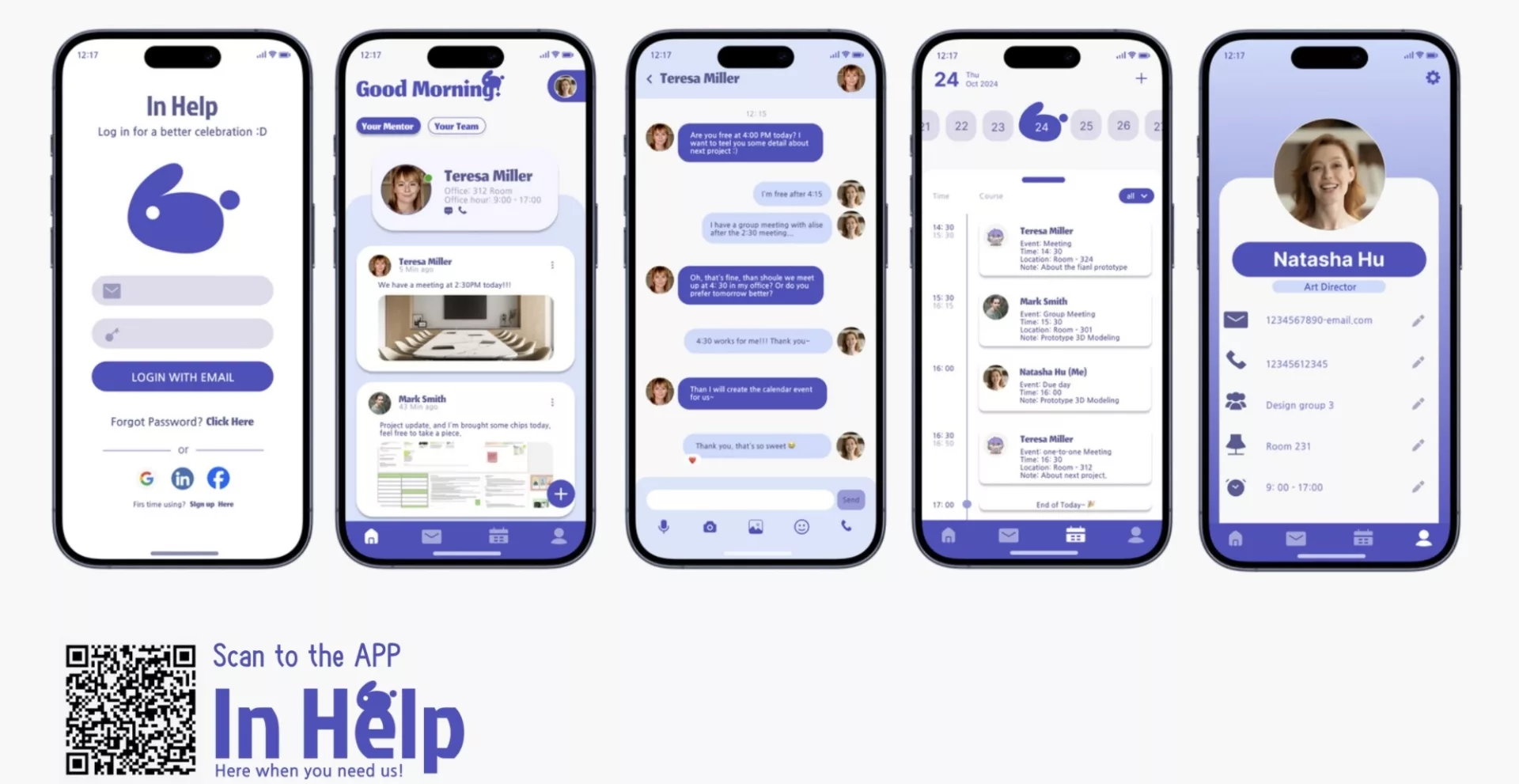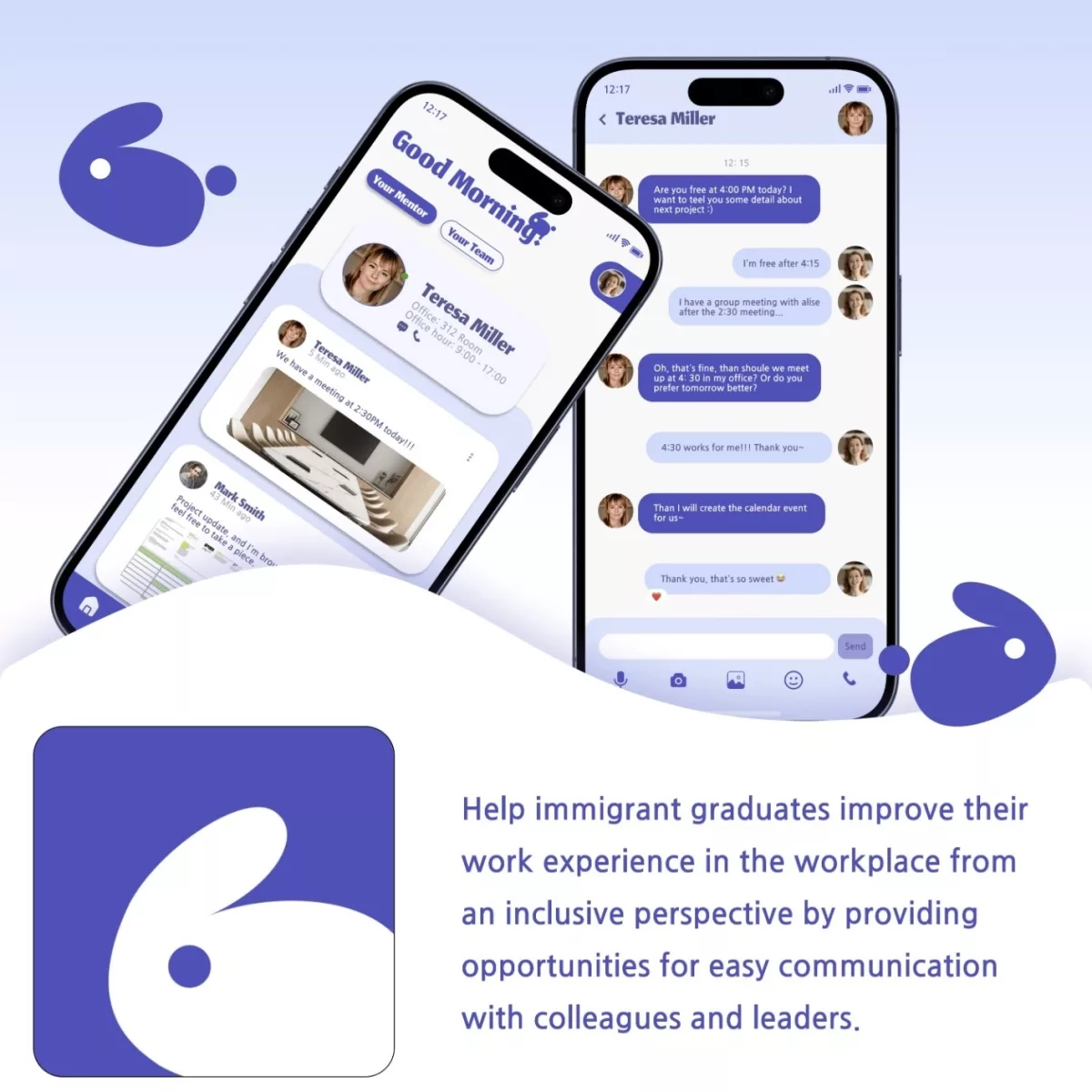 'In Help' is an app designed to improve communication efficiency and provide a mentor for each new graduate entering the workplace. It specifically aims to address the challenges immigrant graduates face in feeling included at work, helping them integrate into their work environments more quickly and effectively.