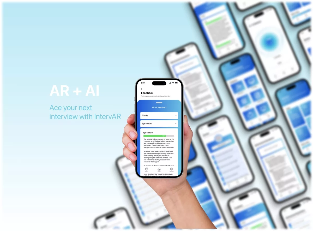 IntervAR is an AR and AI-led application that helps students with interview preparation to mitigate anxiety. The features include an AR screen where a floating orb will ask you questions, which then gives you AI-driven feedback on speech analysis. The speech analysis includes pace, filler words, tone, and eye contact. The speech analysis will use natural language processing, speech and tone analysis, and eye tracking.
