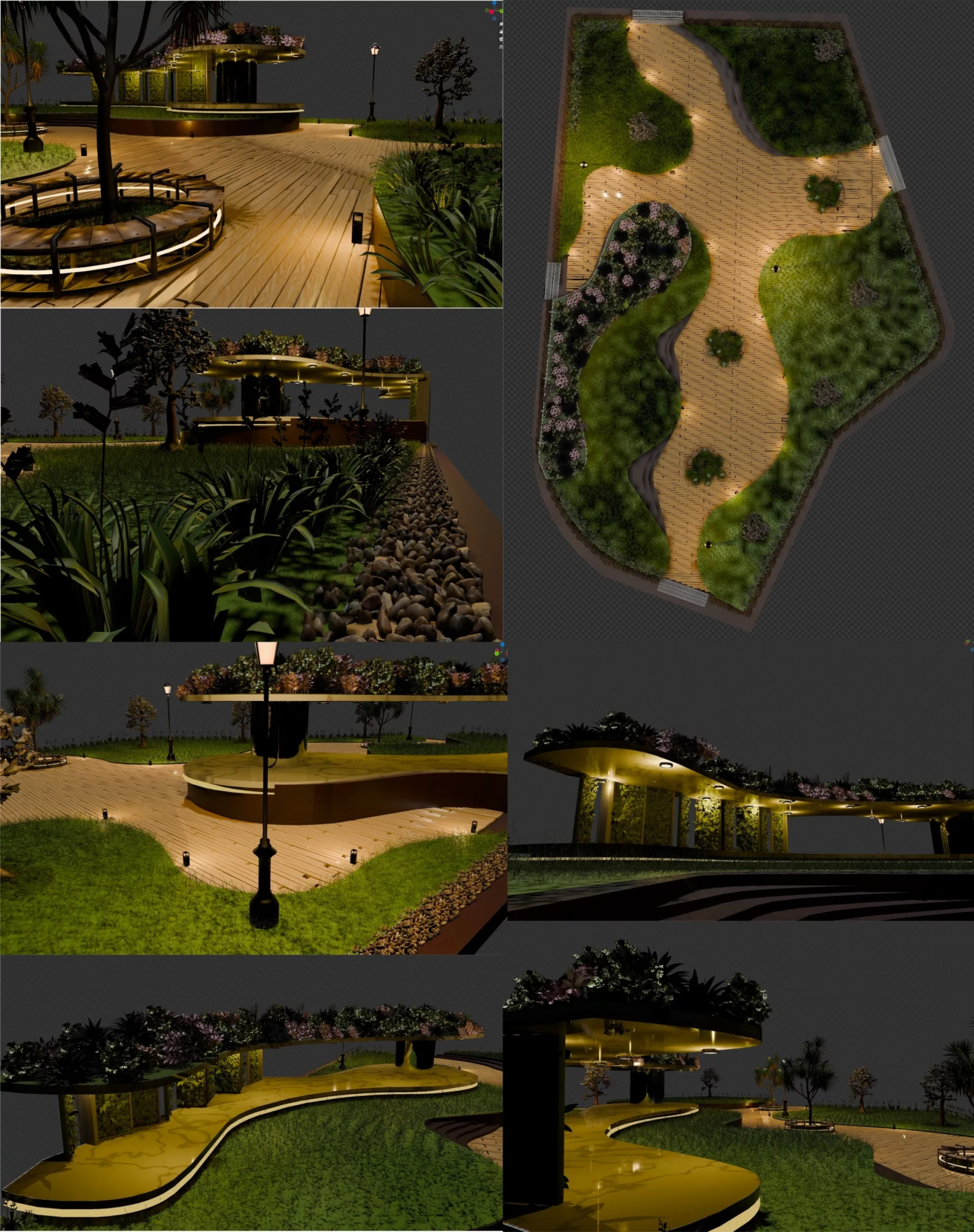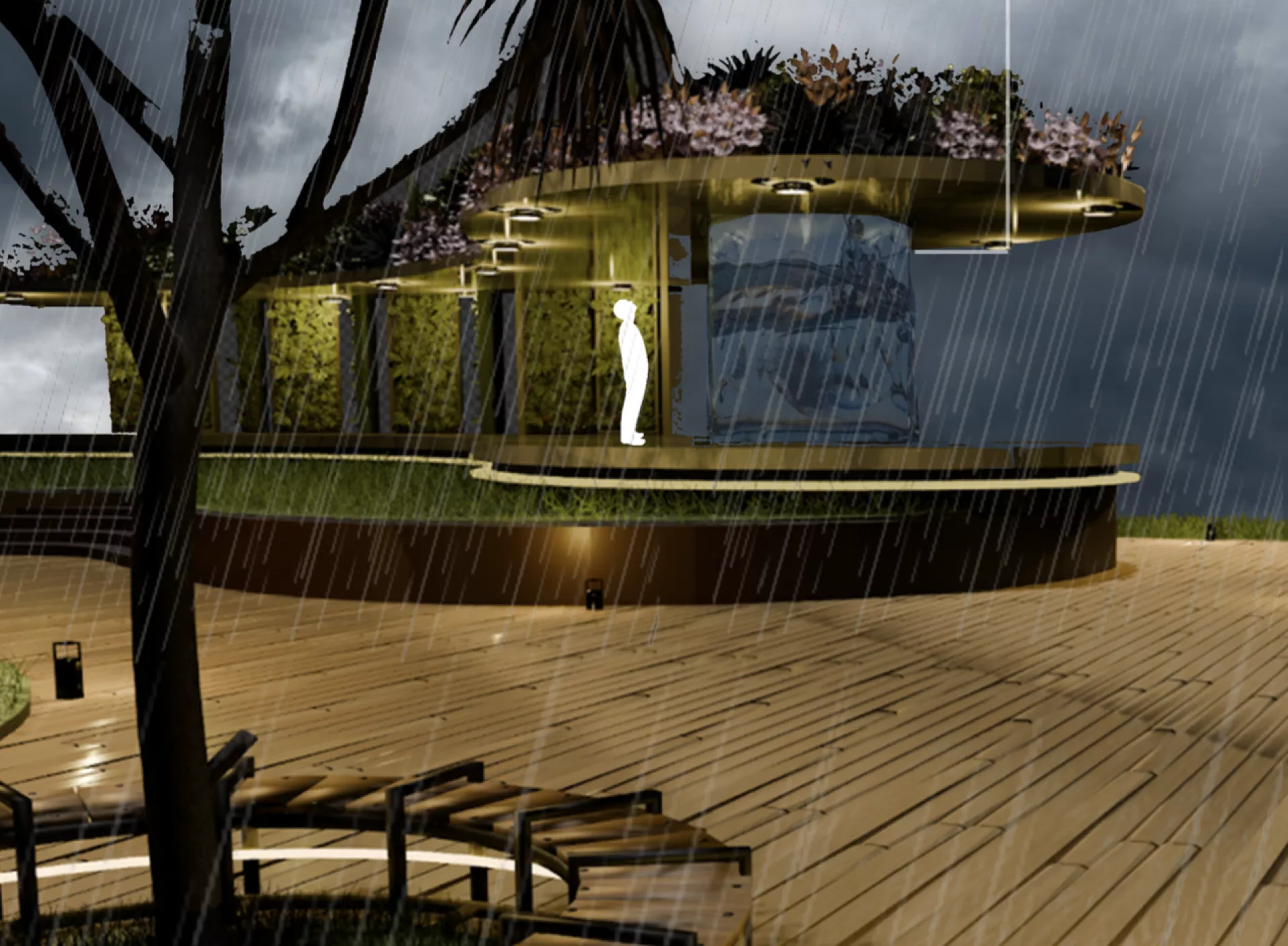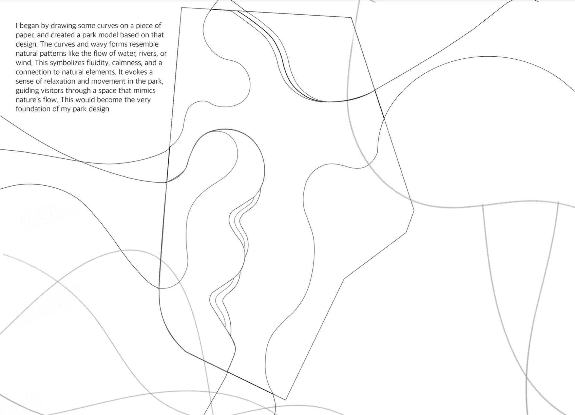 I have created a multifaceted parkspace that integrates a green roof atop a central building, which features innovative rotating garden walls for aesthetic appeal, and a large glass tube, which showcases the drainage of excess water and creates an interactive experience for visitors. The drainage deck serves as the heart of the park, and is designed to manage stormwater effectively while providing essential gathering spaces surrounded by small field areas for recreational activities. The perimeter is lined with vegetative filter strips, reinforcing the park's role in natural water filtration and wildlife habitat creation. Although the drainage system exemplified in this park is hypothetical, it serves as a conceptual tool to illustrate the potential benefits of such infrastructure if properly developed. The rationale for incorporating an underground tank storage system stems from its ability to alleviate overflow issues by capturing excess rainwater during storms, which can then be gradually released into the drainage system or used for irrigation within the park, thereby promoting sustainable water use. Furthermore, I have included it to show what it could look like if co-designed with an engineer. This thoughtful integration of green infrastructure not only enhances the park's ecological function but also improves urban aesthetics, engaging the community and promoting environmental stewardship.