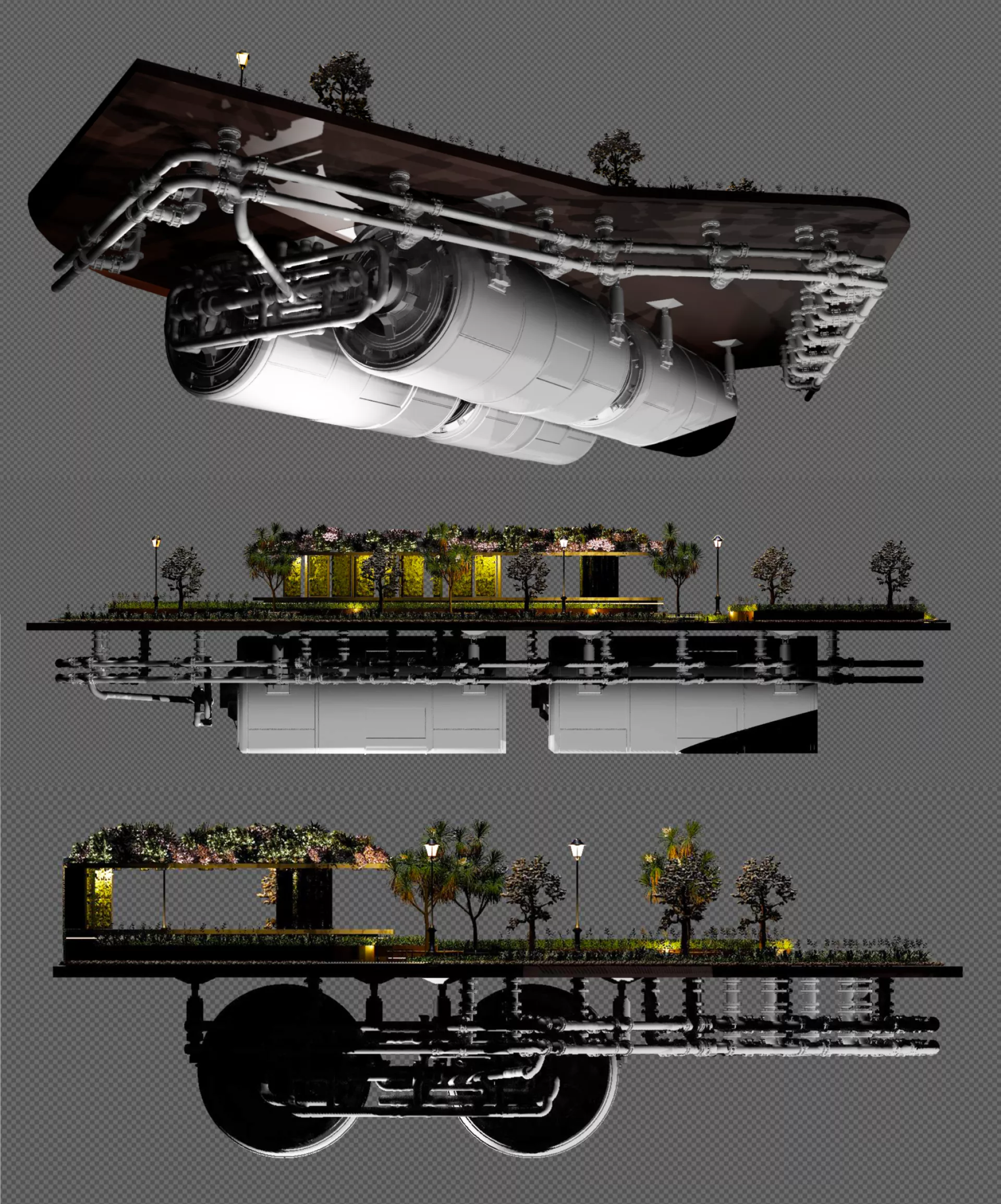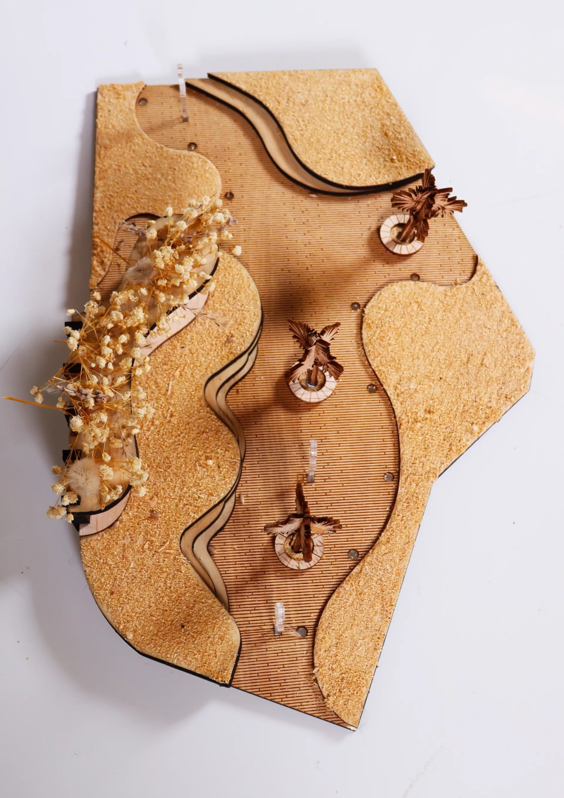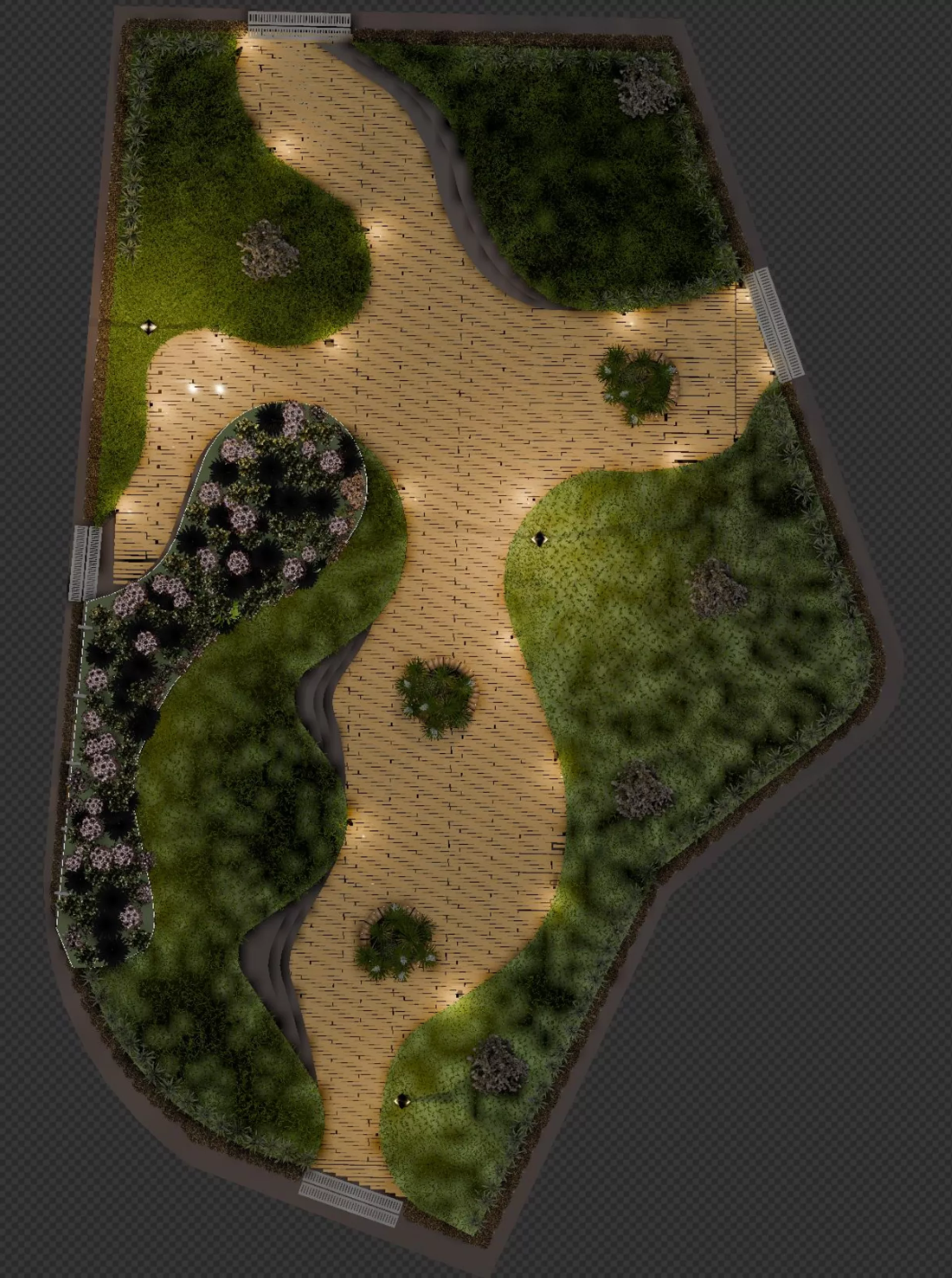 I have created a multifaceted parkspace that integrates a green roof atop a central building, which features innovative rotating garden walls for aesthetic appeal, and a large glass tube, which showcases the drainage of excess water and creates an interactive experience for visitors. The drainage deck serves as the heart of the park, and is designed to manage stormwater effectively while providing essential gathering spaces surrounded by small field areas for recreational activities. The perimeter is lined with vegetative filter strips, reinforcing the park's role in natural water filtration and wildlife habitat creation. Although the drainage system exemplified in this park is hypothetical, it serves as a conceptual tool to illustrate the potential benefits of such infrastructure if properly developed. The rationale for incorporating an underground tank storage system stems from its ability to alleviate overflow issues by capturing excess rainwater during storms, which can then be gradually released into the drainage system or used for irrigation within the park, thereby promoting sustainable water use. Furthermore, I have included it to show what it could look like if co-designed with an engineer. This thoughtful integration of green infrastructure not only enhances the park's ecological function but also improves urban aesthetics, engaging the community and promoting environmental stewardship.
