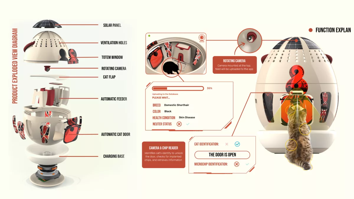 On the other hand, the NOHO EGG is a smart shelter designed to meet the basic needs of stray cats while also acting as a trap for those requiring medical attention. The shelter is equipped with automatic feeders and smart cameras that identify cats, detect common diseases, and check for neutering status. This information is then uploaded to a database, aiding organisations in rescue and control efforts.