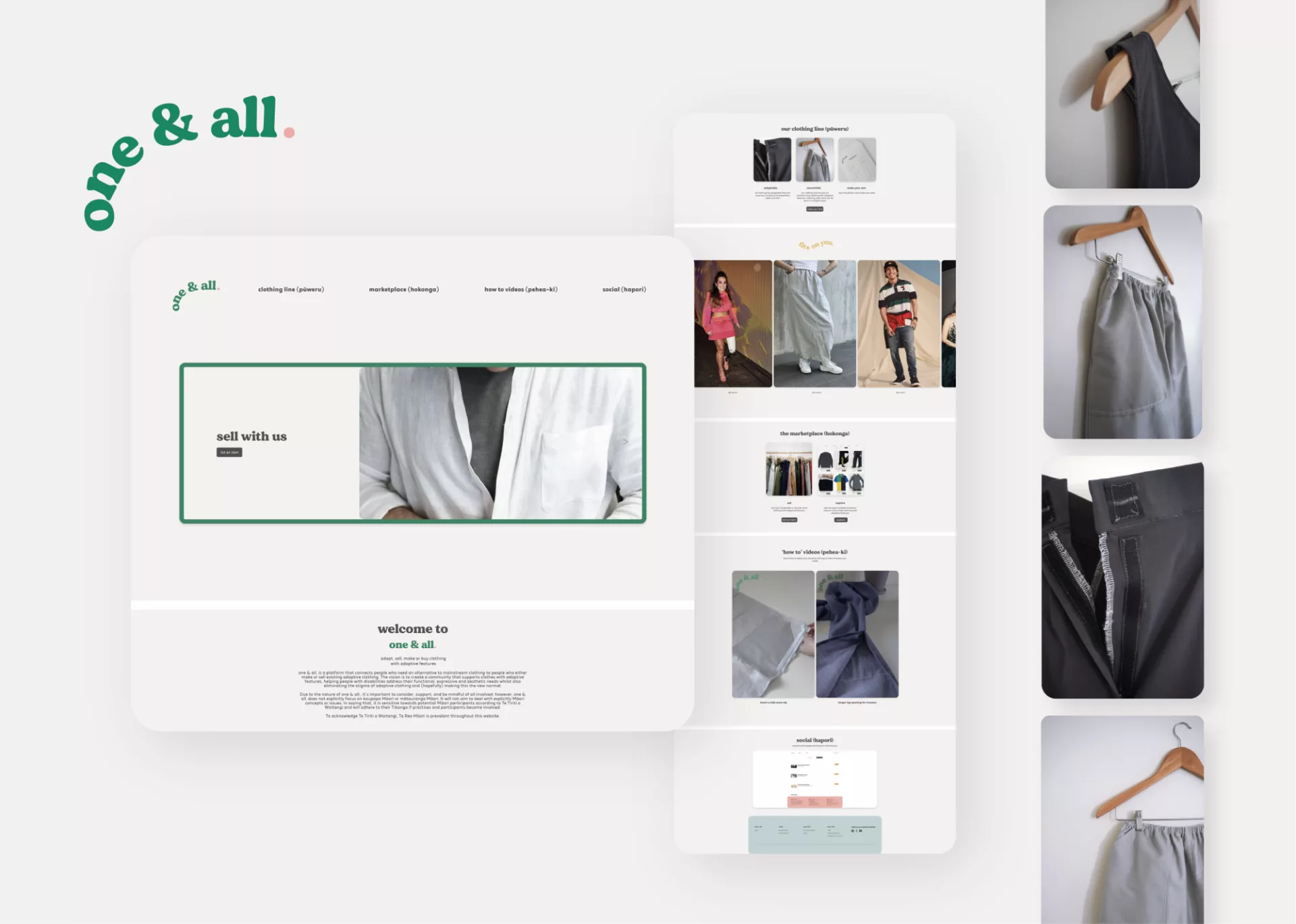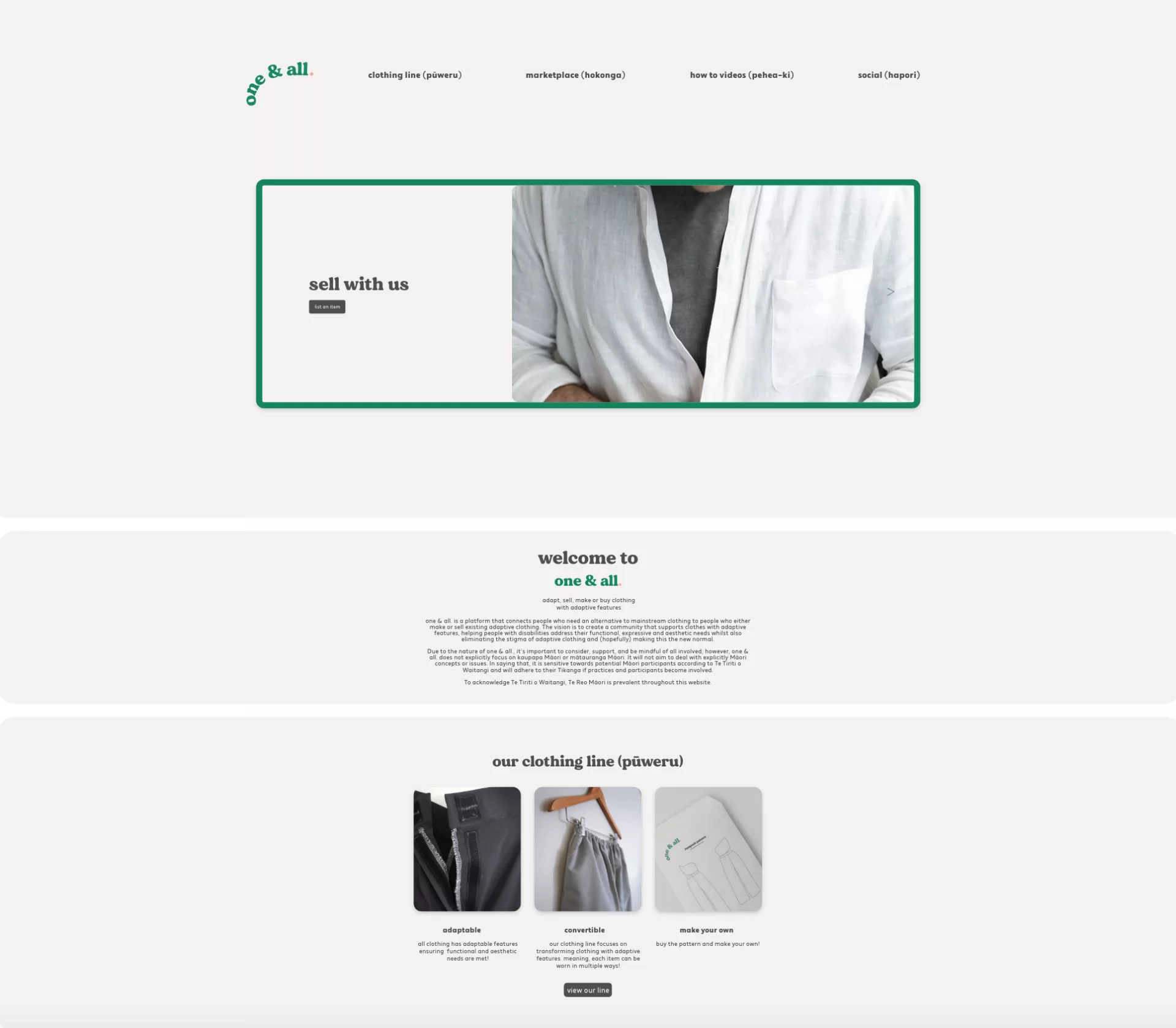 one & all. is a platform connecting people who need an alternative to mainstream clothing (due to physical disabilities) to people who either make or sell existing adaptive clothing. There are four categories to this platform. The clothing line (pūweru) specialises in clothing with adaptive features that are transforming, making each item of clothing able to be worn in many ways. The marketplace (hokonga) allows specialised sewists to upload their handmade garments with adaptive features but also allows people to sell their secondhand adaptive clothing items. The third platform uses 'how-to' videos (pehea-ki) to teach people how to adapt their clothing and a social forum (hapori) for community discussion. The vision of one & all. is to create a community that supports clothes with adaptive features, helping people with disabilities address their functional, expressive and aesthetic needs while eliminating the stigma of adaptive clothing and (hopefully) making this the new normal.