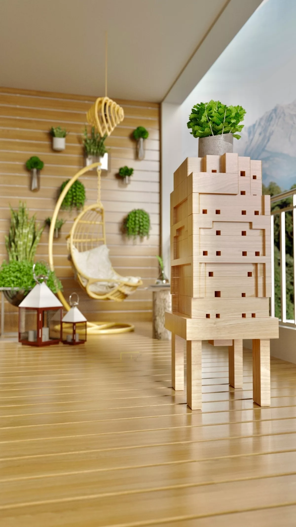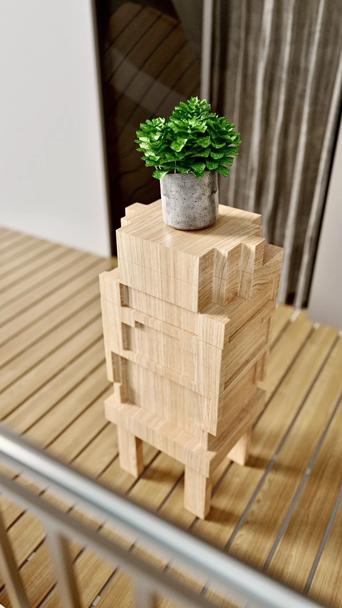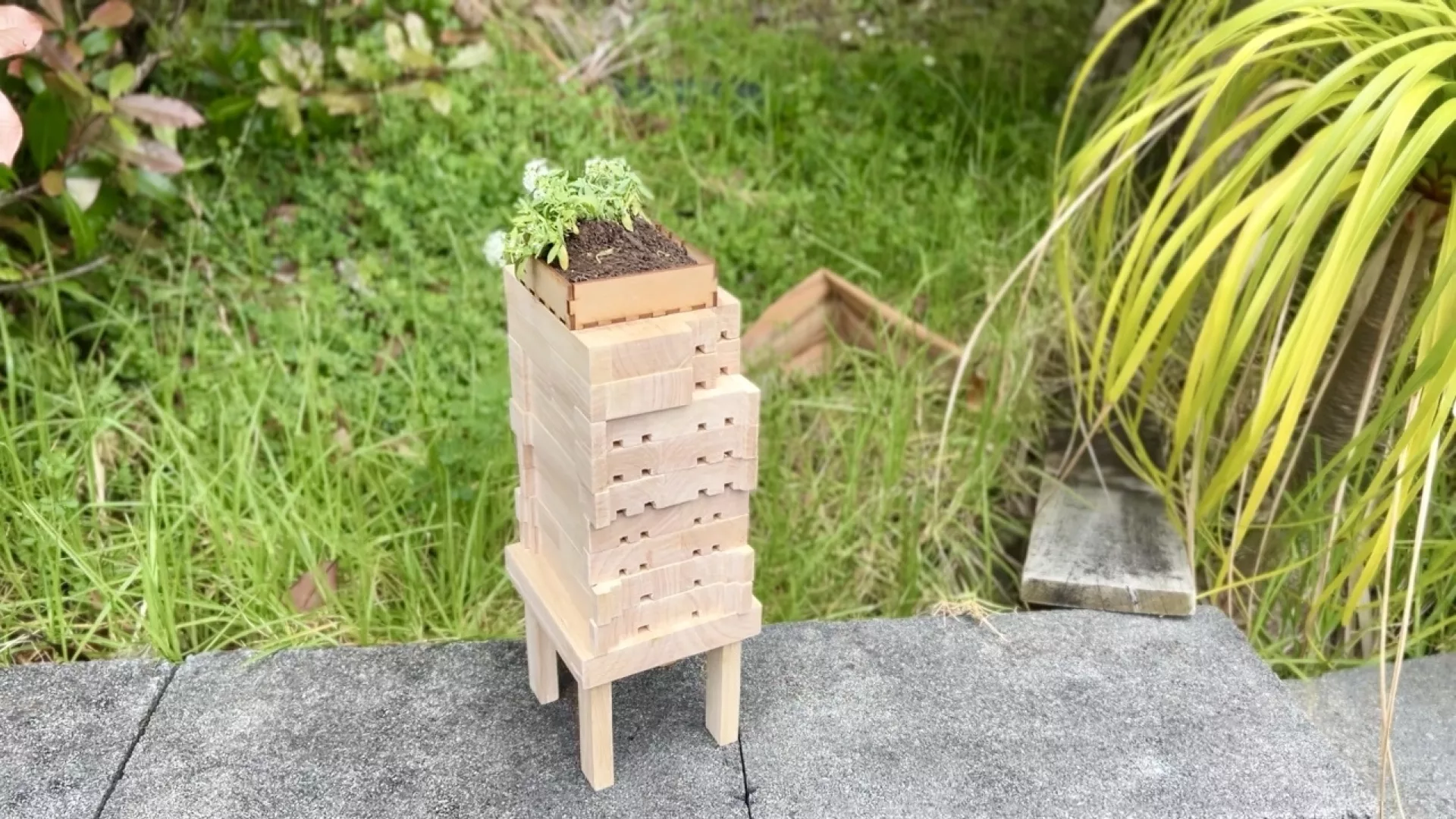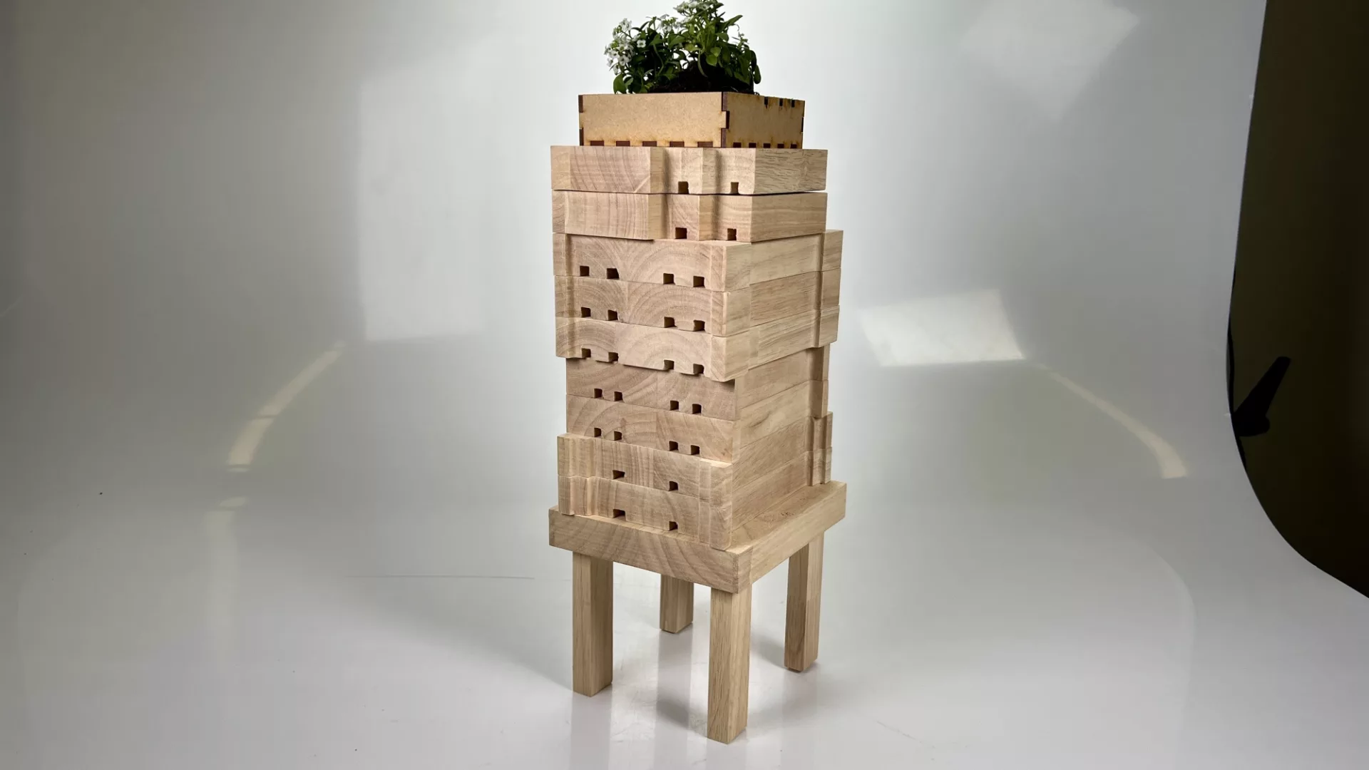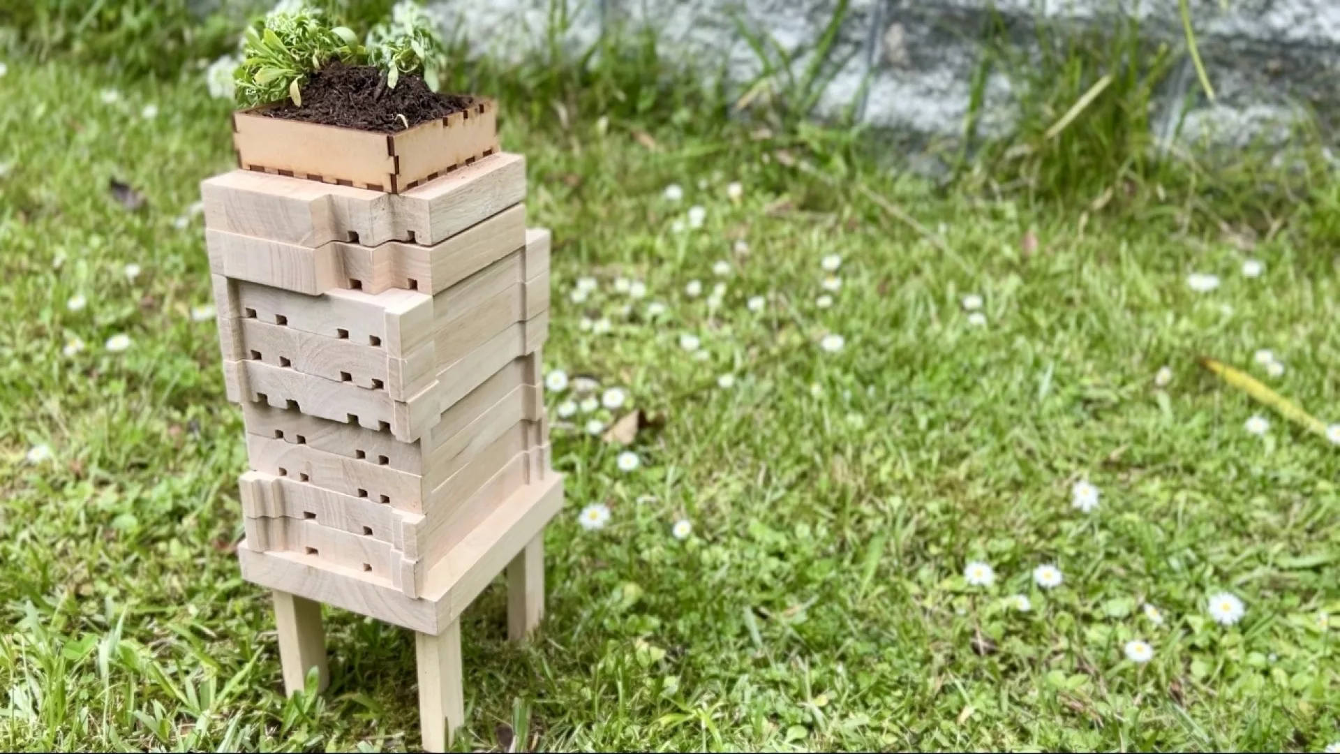 To address their habitat loss, the Plan Bee project creates bee homes that offer shelter to these bees. It is made with several layers of pine wood connected together with small holes. The small holes are designed to mimic the real natural solitary bee nests and provide a safe place for them to live and store food. The vase on the top attracts bees, and you can put any plants that bees like.