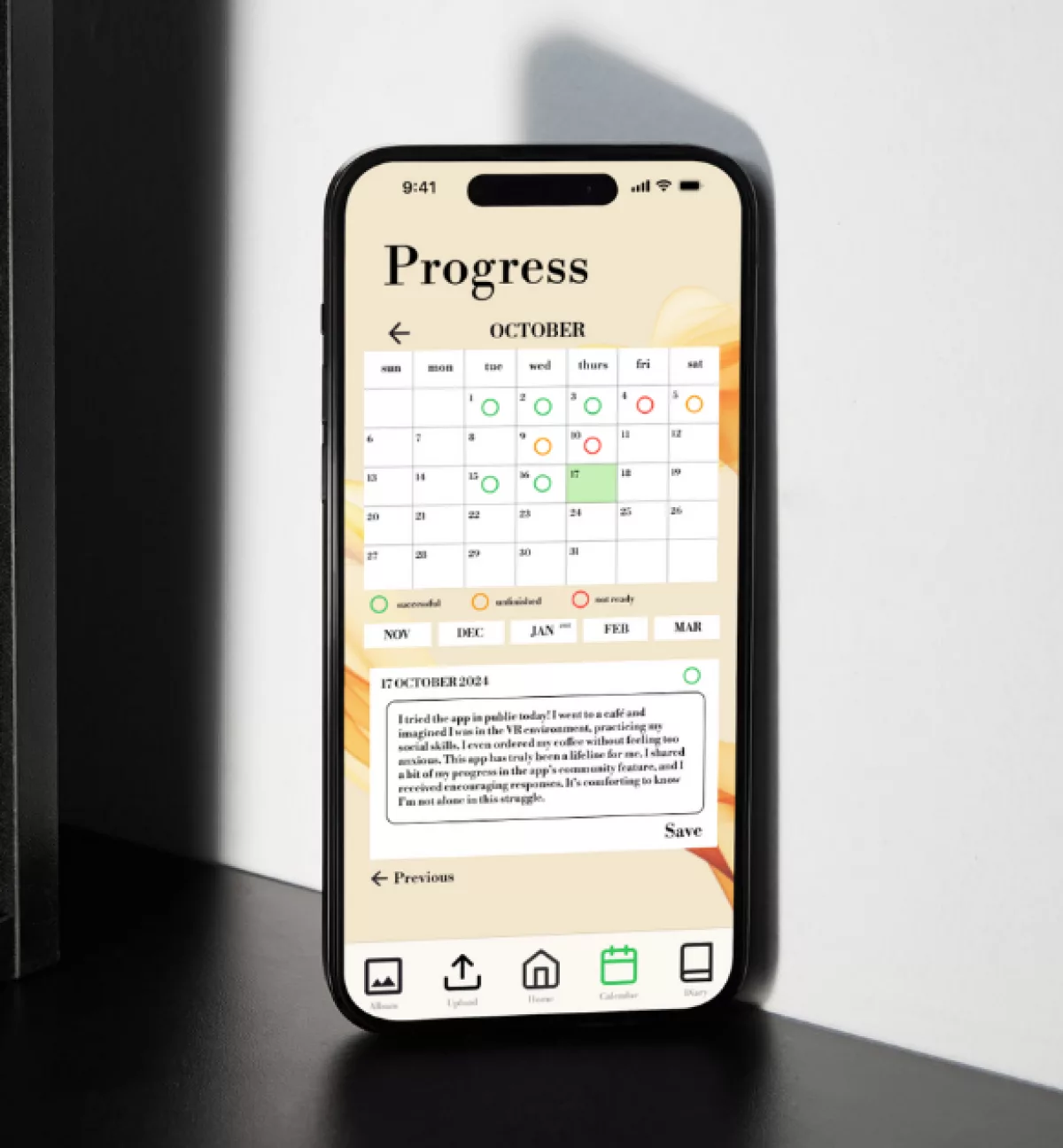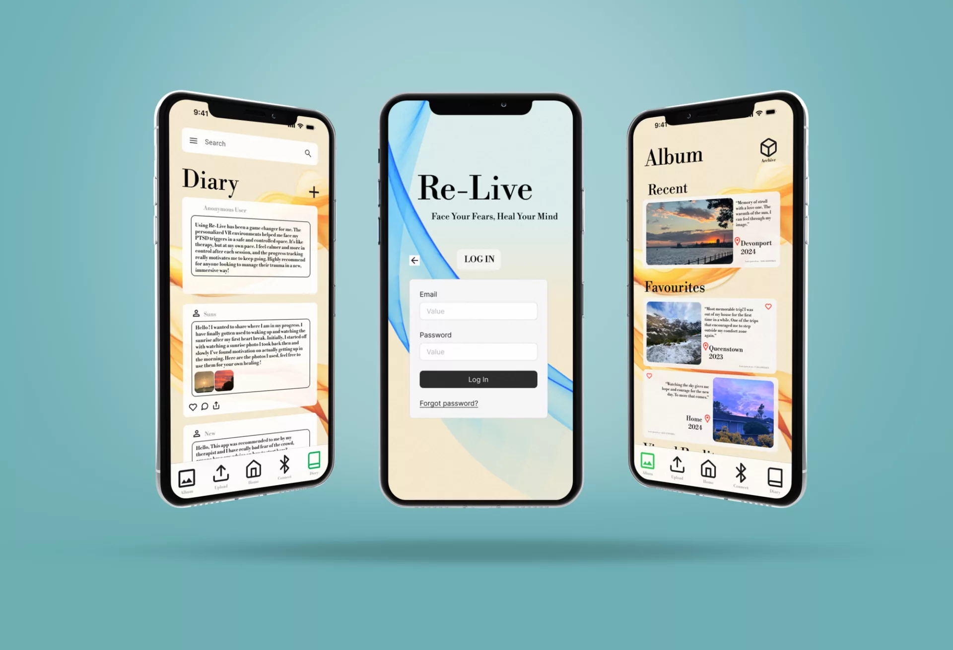 The app's main features include customizable VR experiences, a diary for tracking mental health progress, and the integration of user-uploaded media to build personalized spaces that resonate with their memories. By combining exposure therapy with calming, familiar content, Re-Live empowers users to approach healing at their own pace, making the process both supportive and adaptable to individual needs. Through thoughtful design and user-centric methodology, Re-Live aims to bridge the gap between mental health support and accessible digital tools.