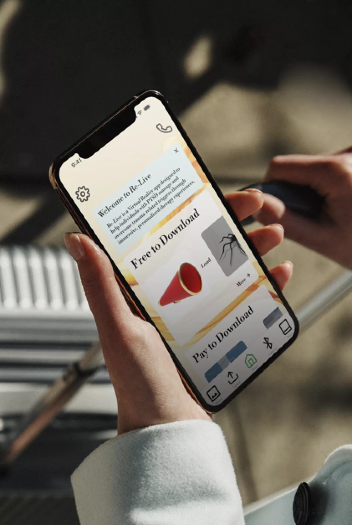 Re-Live is an innovative app designed to support individuals navigating their journey toward emotional well-being and trauma recovery. Targeted particularly at younger generations, Re-Live leverages Virtual Reality (VR) technology to create personalized, immersive experiences aimed at managing and overcoming PTSD-related triggers. Unlike conventional exposure therapies, Re-Live offers users a dual approach: the ability to face fears gradually in a controlled, customizable environment, and the option to engage with positive memories that promote relaxation and emotional balance.