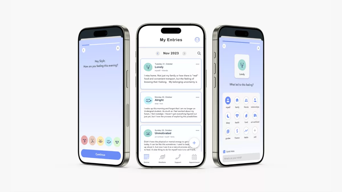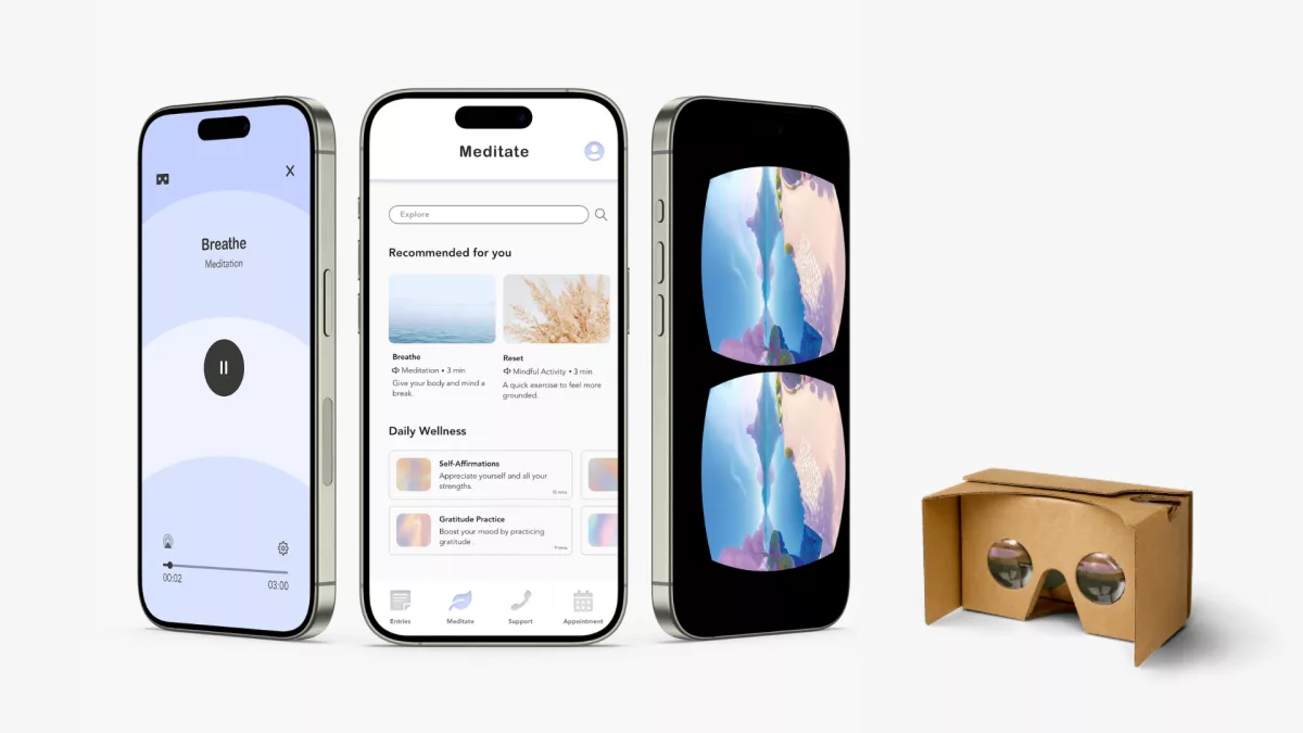 ReLine provides a secure space for students to express their thoughts and emotions through journaling, make emergency calls, connect with trained professionals, and practice mindfulness with the unique addition of an immersive experience using Google Cardboard.