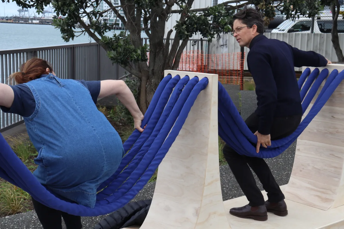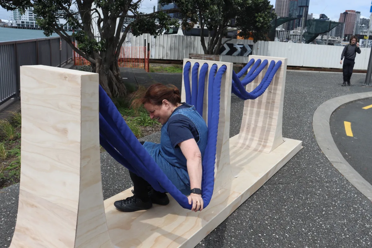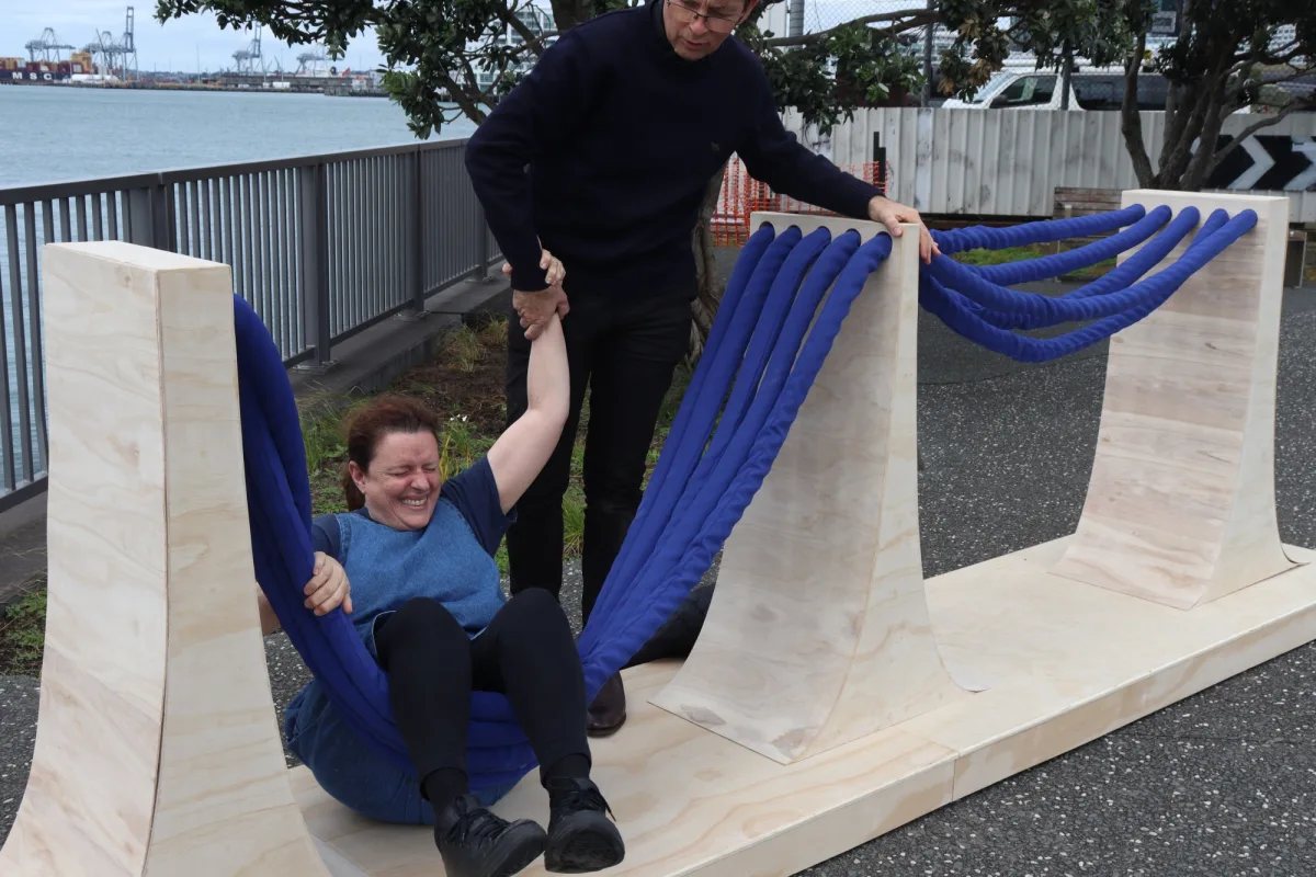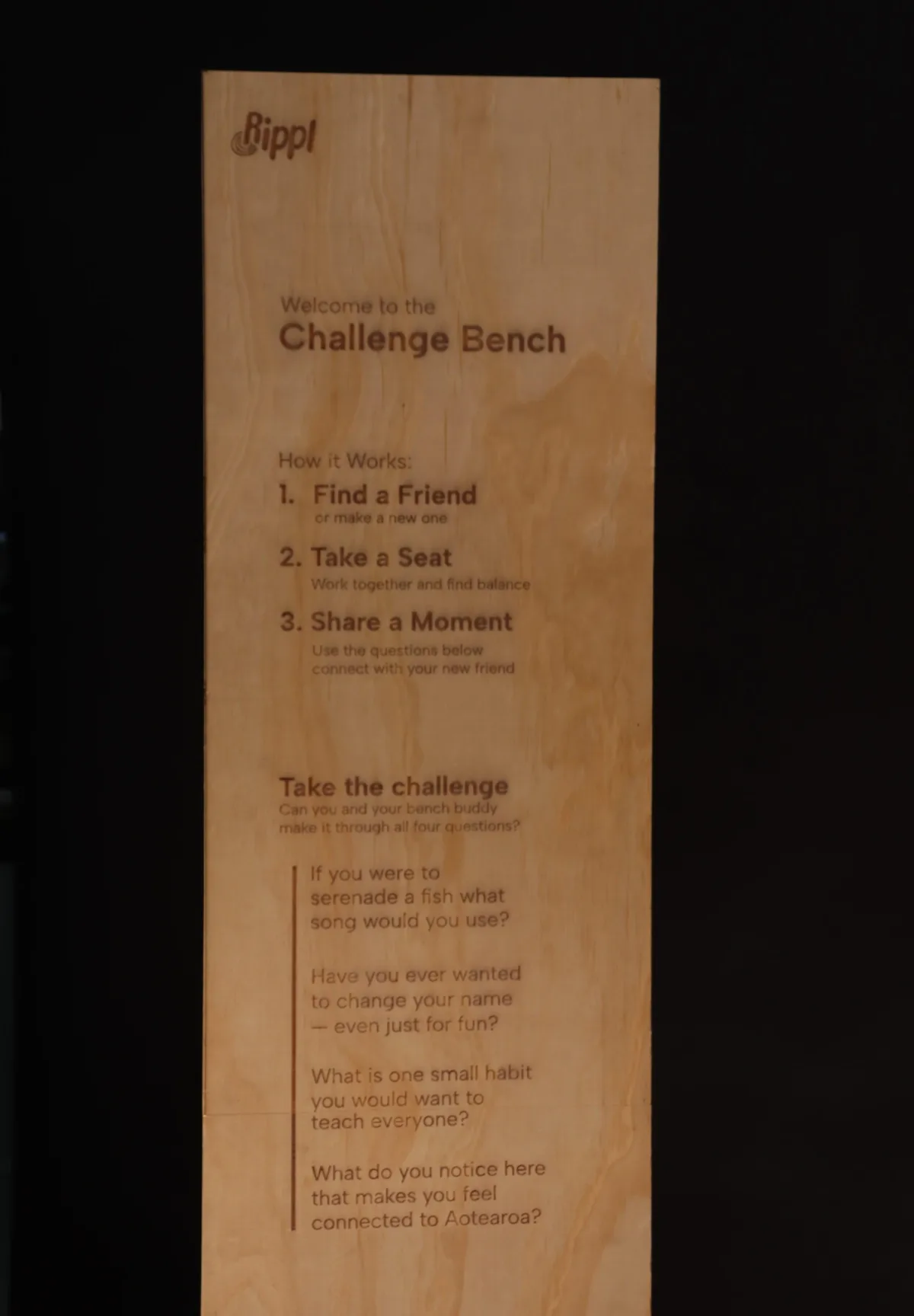 This project responds to the growing social division and loneliness amplified by political polarisation and a decline in face-to-face connection. As open, meaningful conversations become less common, social cohesion and wellbeing have weakened. Named Rippl, the design symbolises how small moments of interaction can create wider ripples of connection across the community. The bench encourages visitors to Te Ara Tukutuku to collaborate through a shared seating experience. Situated within the Wynyard Point redevelopment, its rope-inspired form references the maritime heritage of the harbour, embedding the design within the identity of place. The bench requires two or more people to use it, breaking the barrier to conversation through play and shared problem-solving. Accompanying signage offers prompts that guide participants from light exchanges to deeper dialogue. Inviting curiosity and playfulness, the project demonstrates how small-scale, participatory design can rebuild a sense of belonging and strengthen community wellbeing.