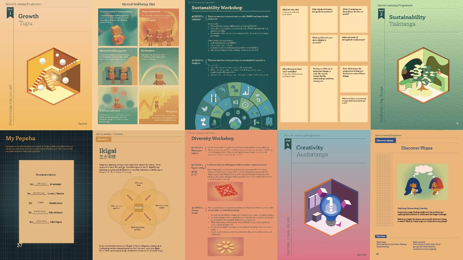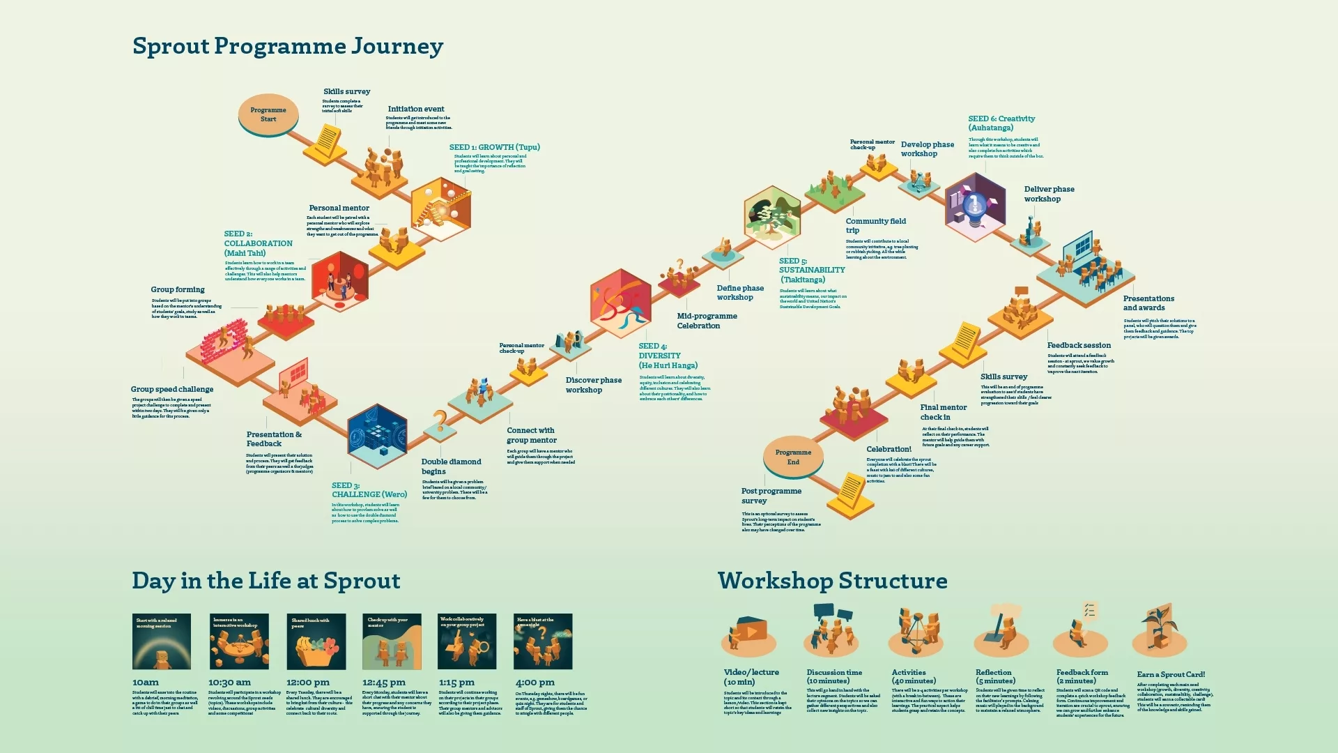 For each of these seeds, students will accomplish a series of tasks and workshops to achieve a card collectable for the given seed. In their journey, students will embark on a project focused on their local communities, for which they will collaborate with their teams to identify a problem and produce a solution. Sprout workshops use a combination of learning modes and practical activities to facilitate better engagement and understanding of the topics.