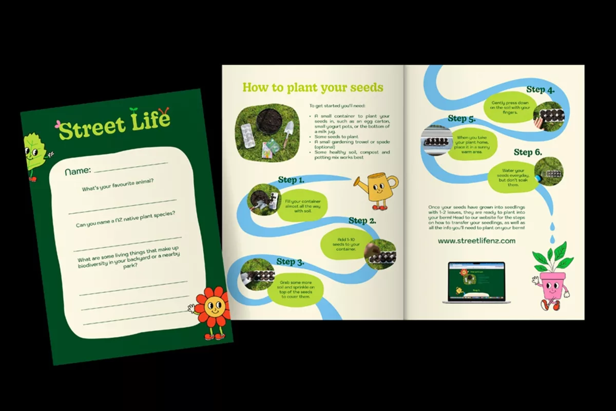 The project's purpose is to create an educational campaign to educate children about this problem and encourage them and their community to plant native species on berms, to enhance urban biodiversity and install a sense of empathy, understanding and responsibility for the environment and conservation. By providing resources, such as classes/workshops, an informational website, plant supplies and a worksheet, Street Life aims to empower the next generation to act and transform their berms to promote a more biodiverse and conservationally minded Tāmaki Makaurau.