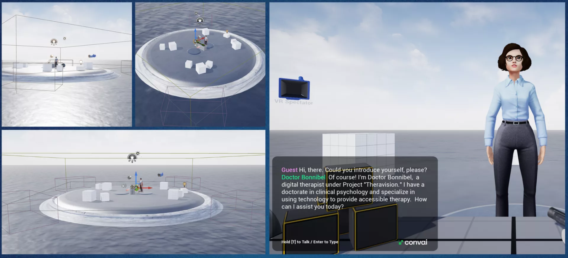 TheraVision is a visionary VR experience that reimagines the landscape of therapeutic support by synergising cutting-edge AI technology with Virtual Reality powered by Unreal Engine. This innovative platform offers a dynamic and immersive space where users can connect with a digital therapist for empathetic interactions and peer support, all within the realm of Virtual Reality.