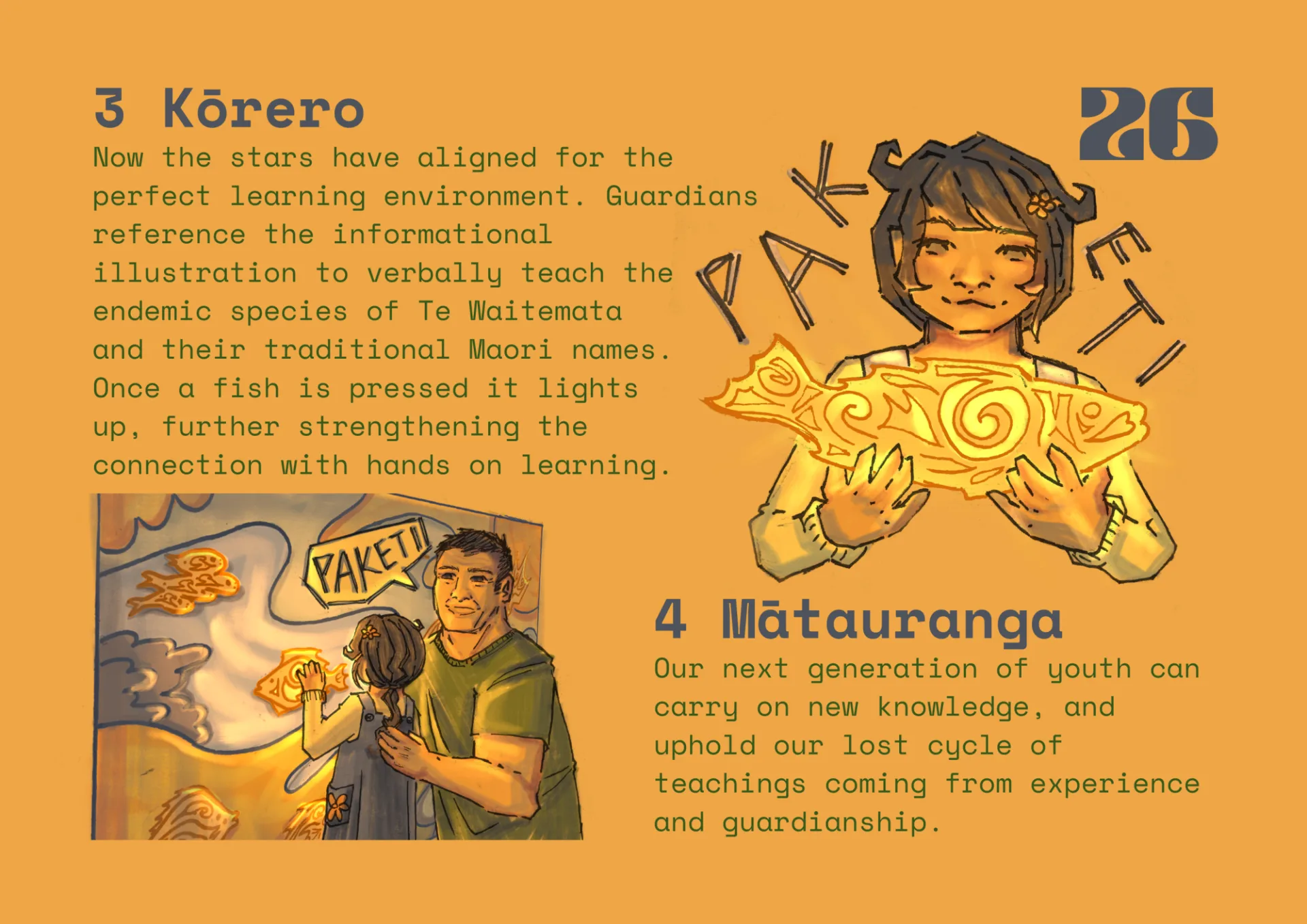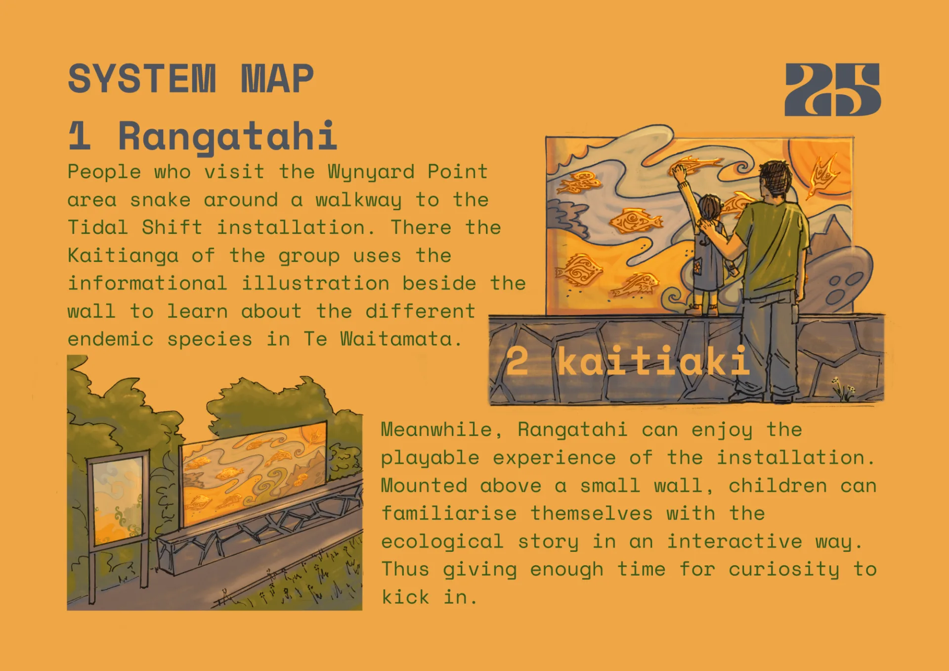 Tidal Shift harnesses the knowledge of many different designs and Mātaranga Māori practices to revitalise traditional Māori community relationships. As a playable installation for youth it also functions as an educational kōrero for any community member who passes its way. It's almost impossible to resist the tactile feel of the design, which will then prompt the koru mana of a species to light up. Curiosity strikes, and one moves over to the informative illustration to determine which species you've engaged with. Thus the cycle of Tidal Shift regeneratively enhances the Te Ara Tukutuku community's connection with each other and Te Waitematā.