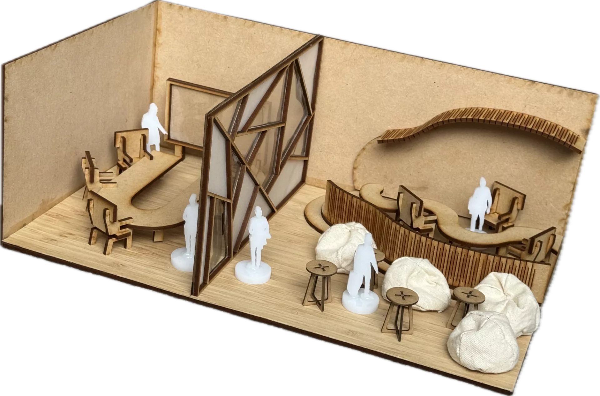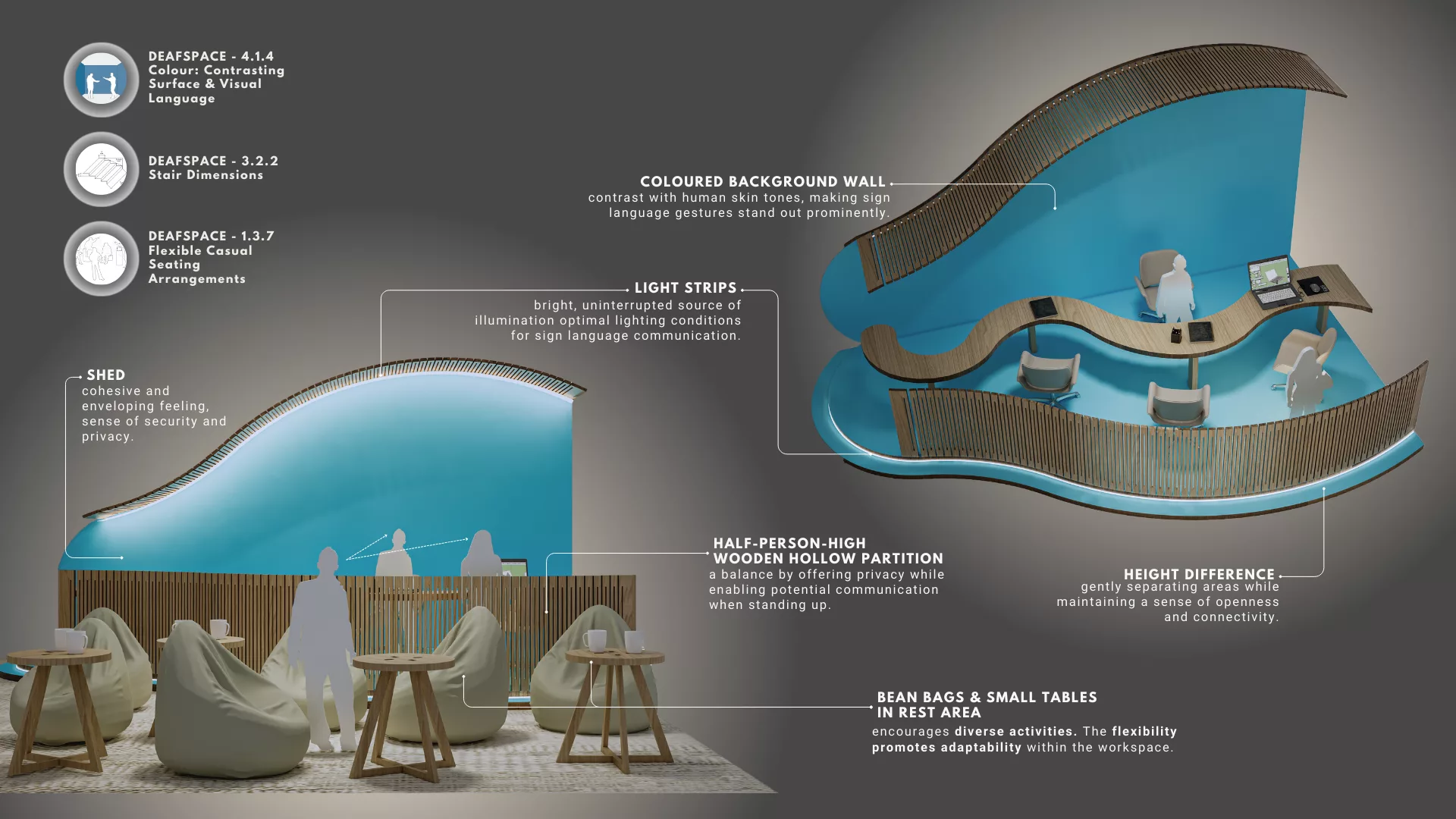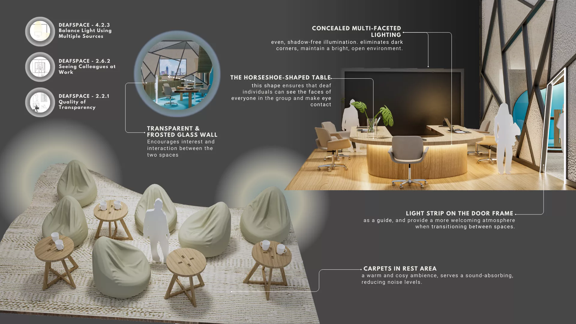 The final office design embodies the principles of Deafspace, a concept rooted in creating environments that embrace the unique sensory experiences of deaf individuals. It features a thoughtfully designed meeting room with a horseshoe-shaped table, a combination of clear and frosted glass walls to promote interaction, and movable bean bags in the rest area for flexibility and comfort, etc. The layout fosters both privacy and openness, enhancing communication and well-being for everyone.