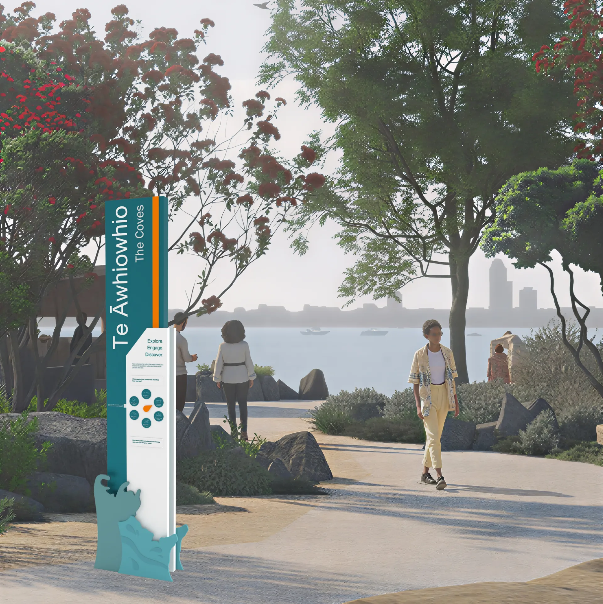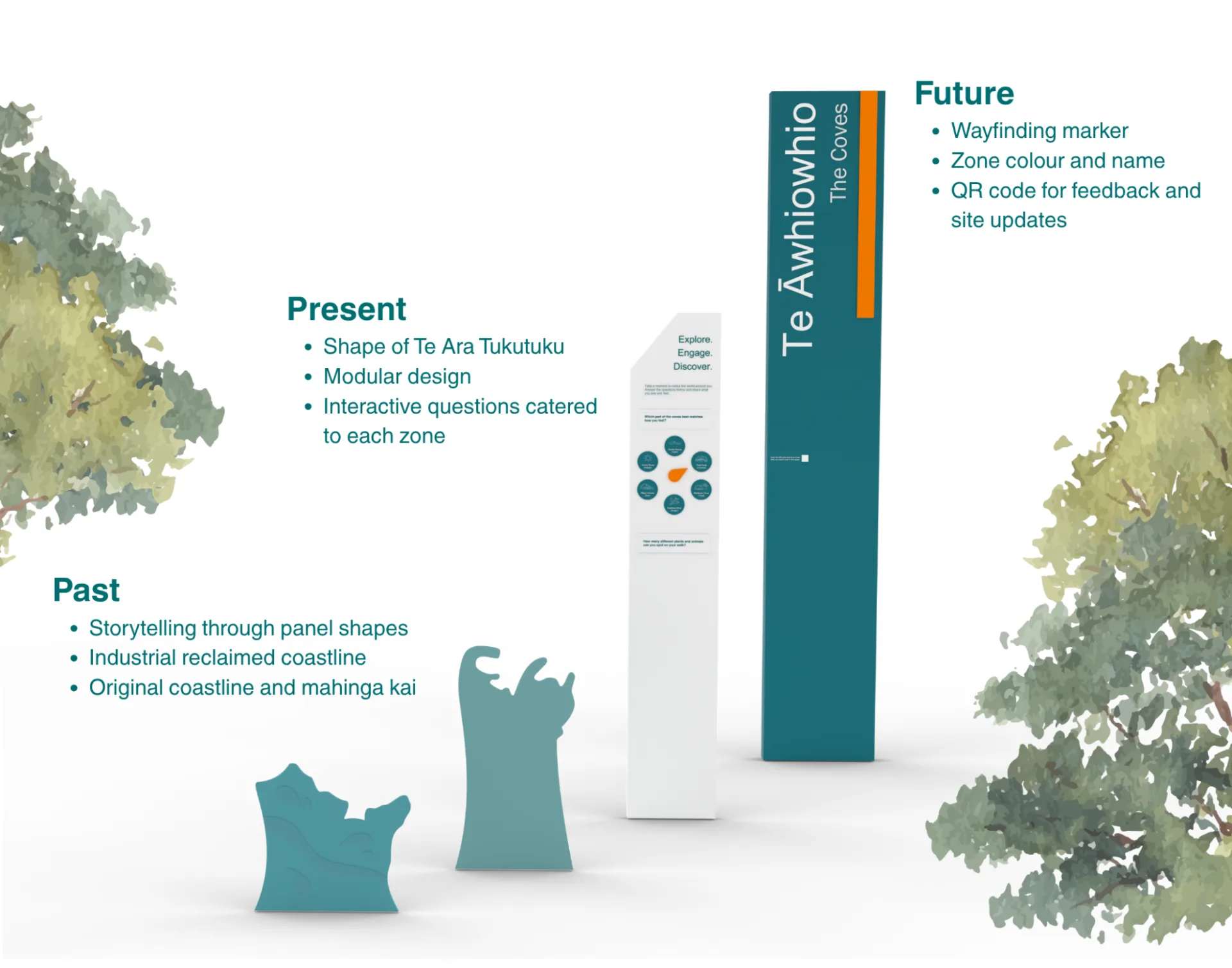 Waypoint is a series of storytelling markers to be placed within the 8 different zones of Te Ara Tukutuku. These markers are designed to be implemented in the present day and updated as the site evolves. Waypoint acts as a bridge between the different life stages and zones of Wynyard Point, telling the story of the past, present and future. Interactive questions further enhance the experience, allowing visitors to reflect, engage and share their experiences in the site. Together, Waypoint works as a reference point in an everchanging world, fostering stronger connections to Te Ara Tukutuku, the natural world and the communities around Wynyard Point.