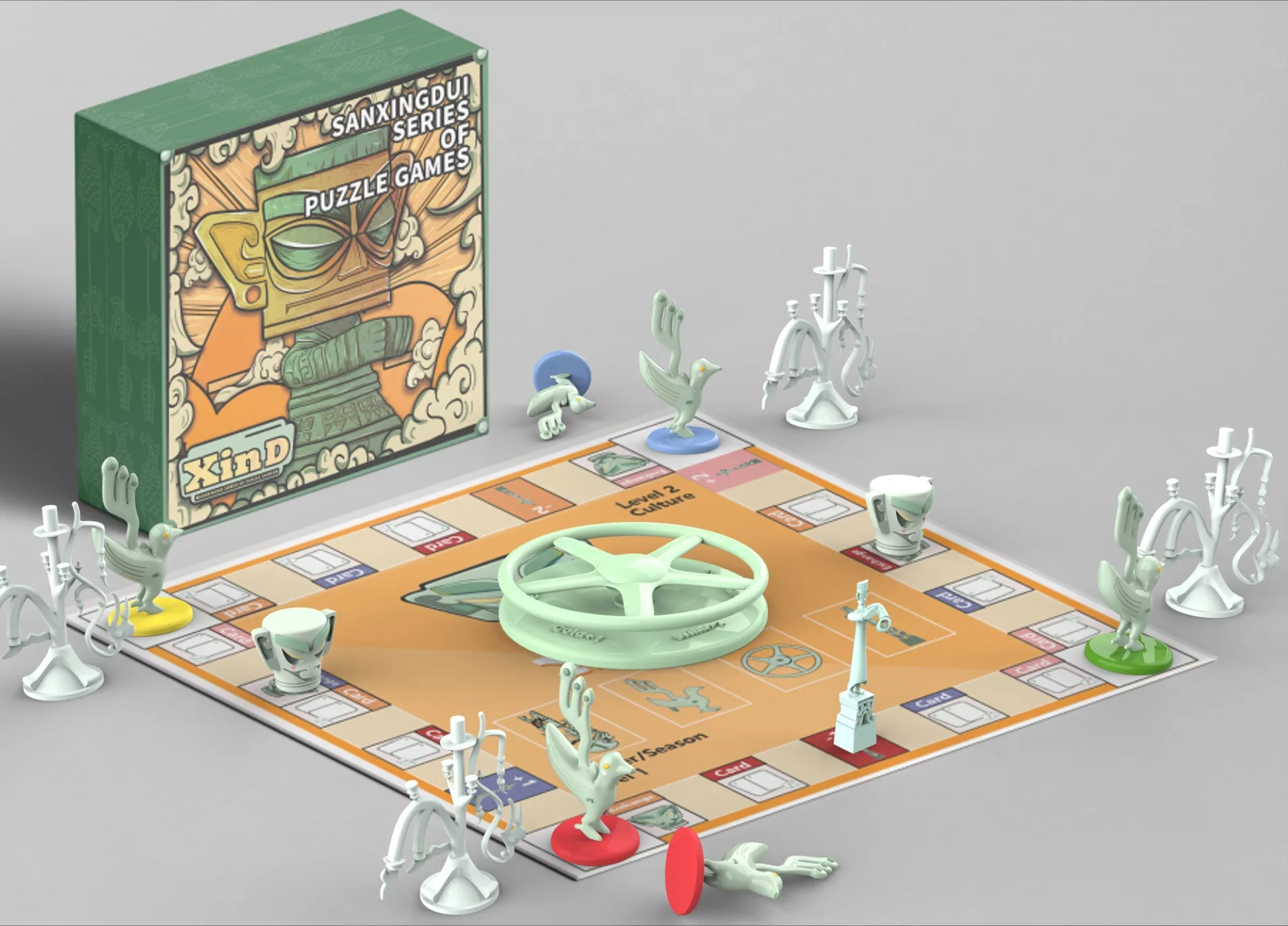 The name of the project is "XinD", short for "Sanxingdui." I designed a board game with the theme of China's "Sanxingdui" for children over eight years old in New Zealand. It is a Chinese culture game that has added the gameplay of exchanging national culture, allowing children to communicate with each other and promoting friendship between countries. This board game is designed to entertain and teach children to play and learn; enhance their social, learning, and communication skills; stimulate their interest in education; and improve their cultural awareness. "Sanxingdui" is located in Sichuan Province, China. It has a cultural history of 3000–5000 years.